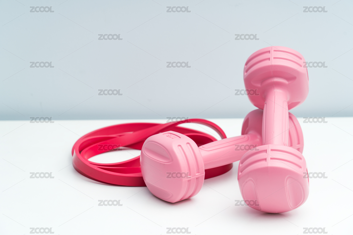 一對粉紅色的啞鈴和紅色拉力帶