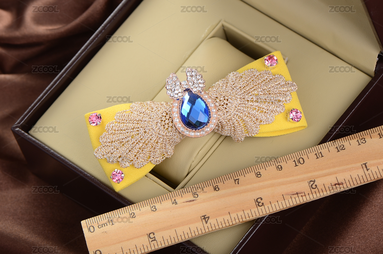 擺放在皮質(zhì)首飾盒子里的一個(gè)黃色布藝蝴蝶結(jié)發(fā)夾