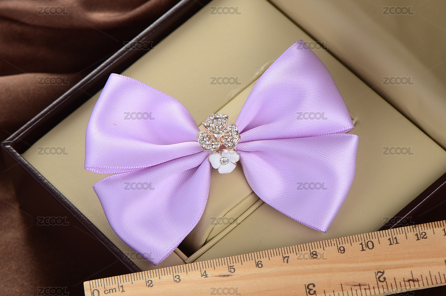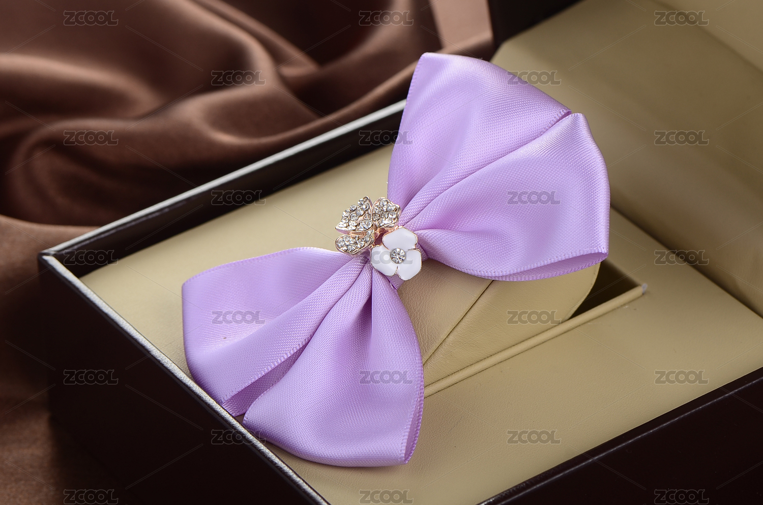 擺放在皮質(zhì)首飾盒子里的一個(gè)紫色布藝蝴蝶結(jié)發(fā)夾