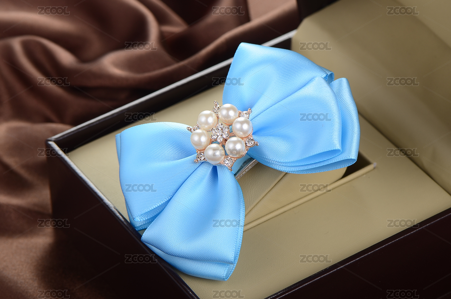 擺放在皮質(zhì)首飾盒子里的一個(gè)藍(lán)色布藝蝴蝶結(jié)發(fā)夾