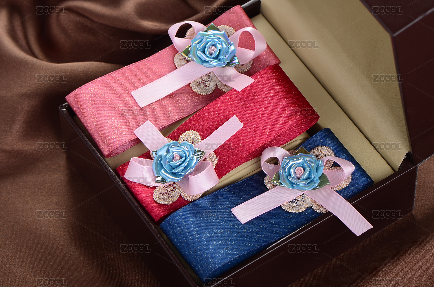 擺放在皮質(zhì)首飾盒子里的布藝發(fā)夾