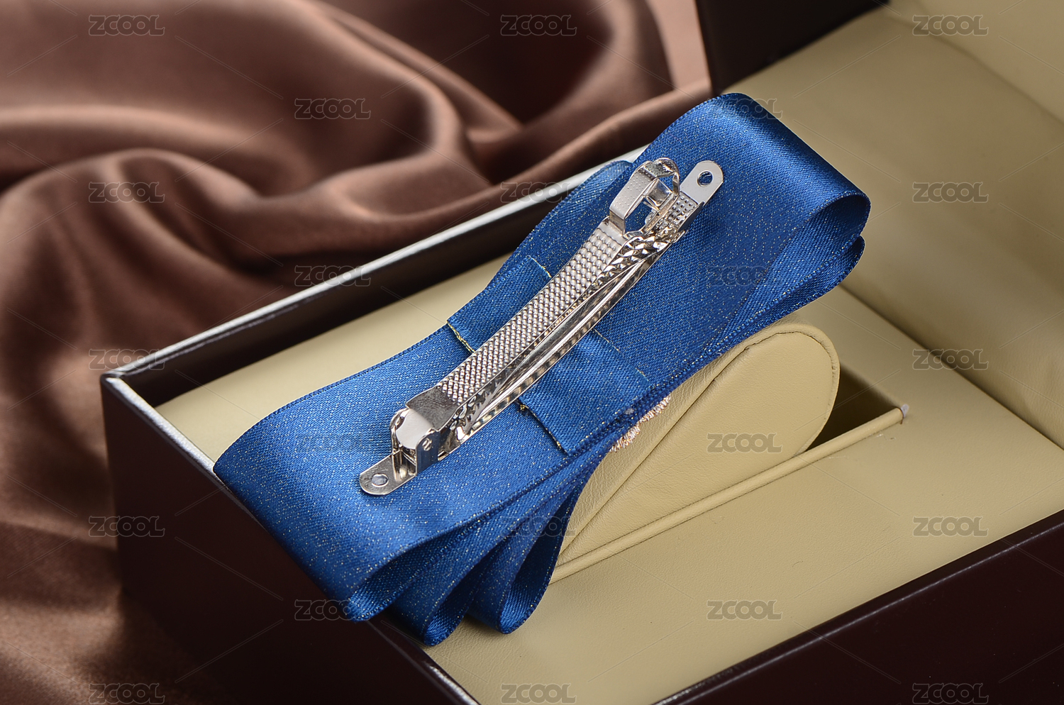 擺放在皮質(zhì)首飾盒子里的一個(gè)藍(lán)色布藝發(fā)夾背面特寫(xiě)