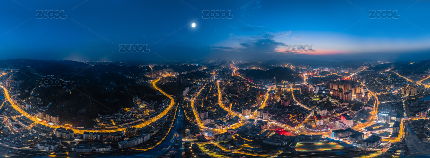 中國貴州省遵義市720度全景夜晚月亮高樓