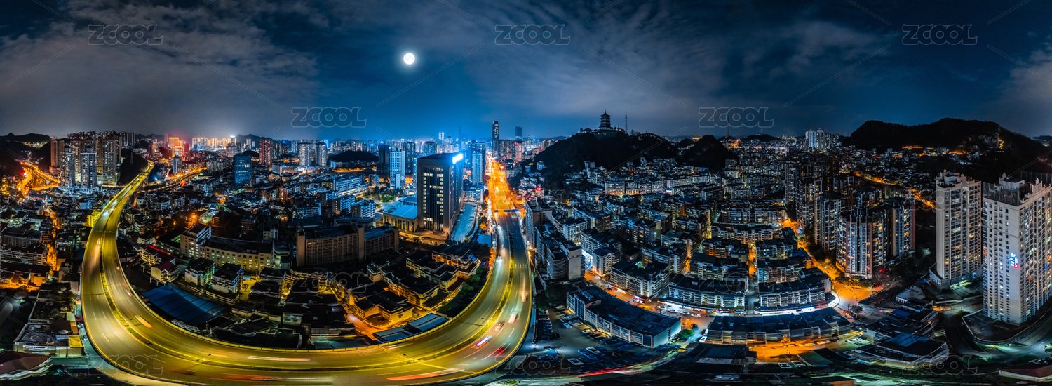 中國貴州省貴陽市720度全景夜晚月亮高樓