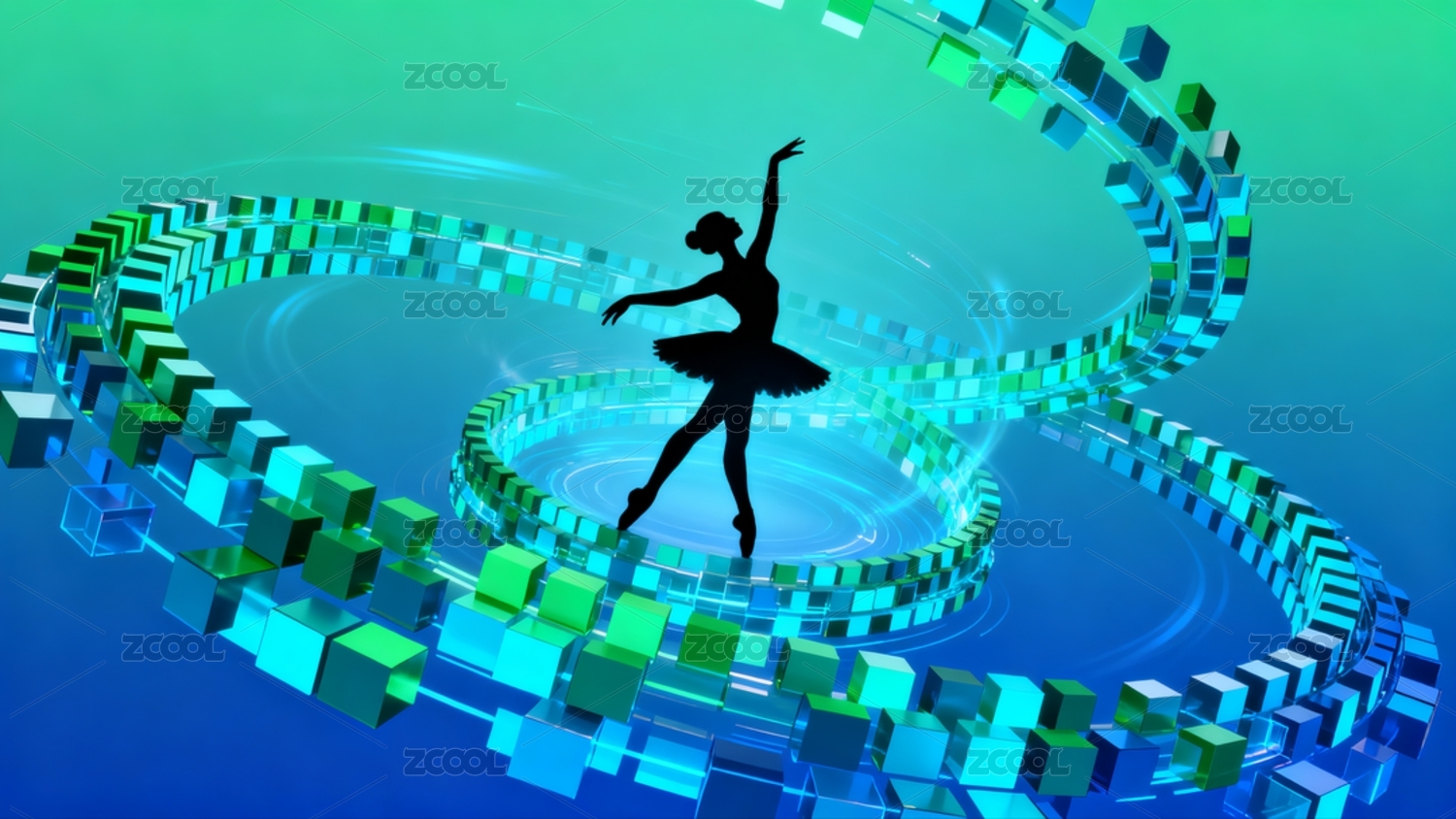 藍(lán)綠色背景下跳芭蕾的人物與立體方塊