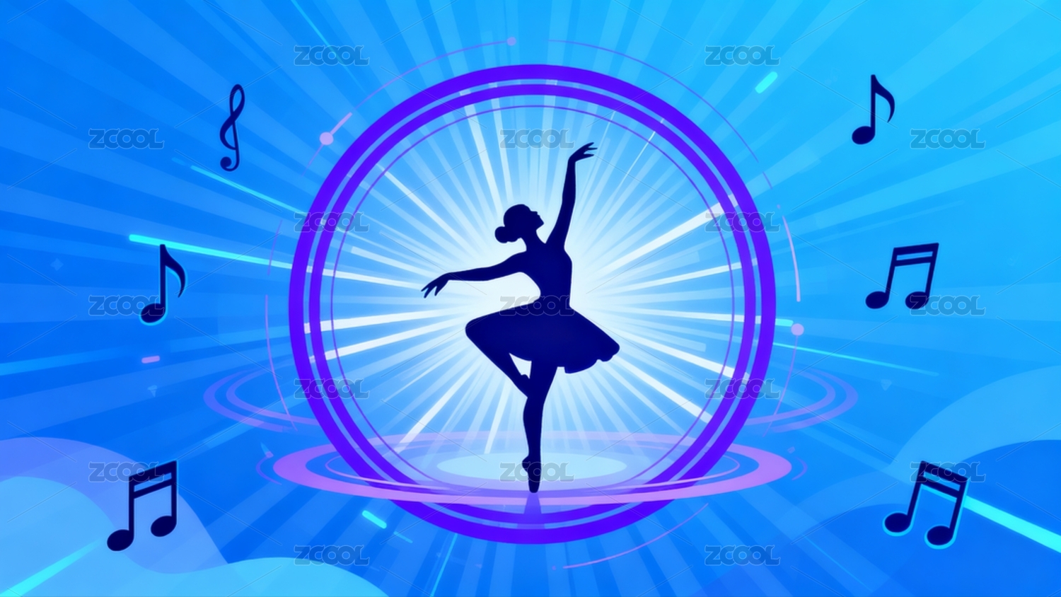 藍(lán)色背景下跳芭蕾舞的人物與音樂(lè)符號(hào)