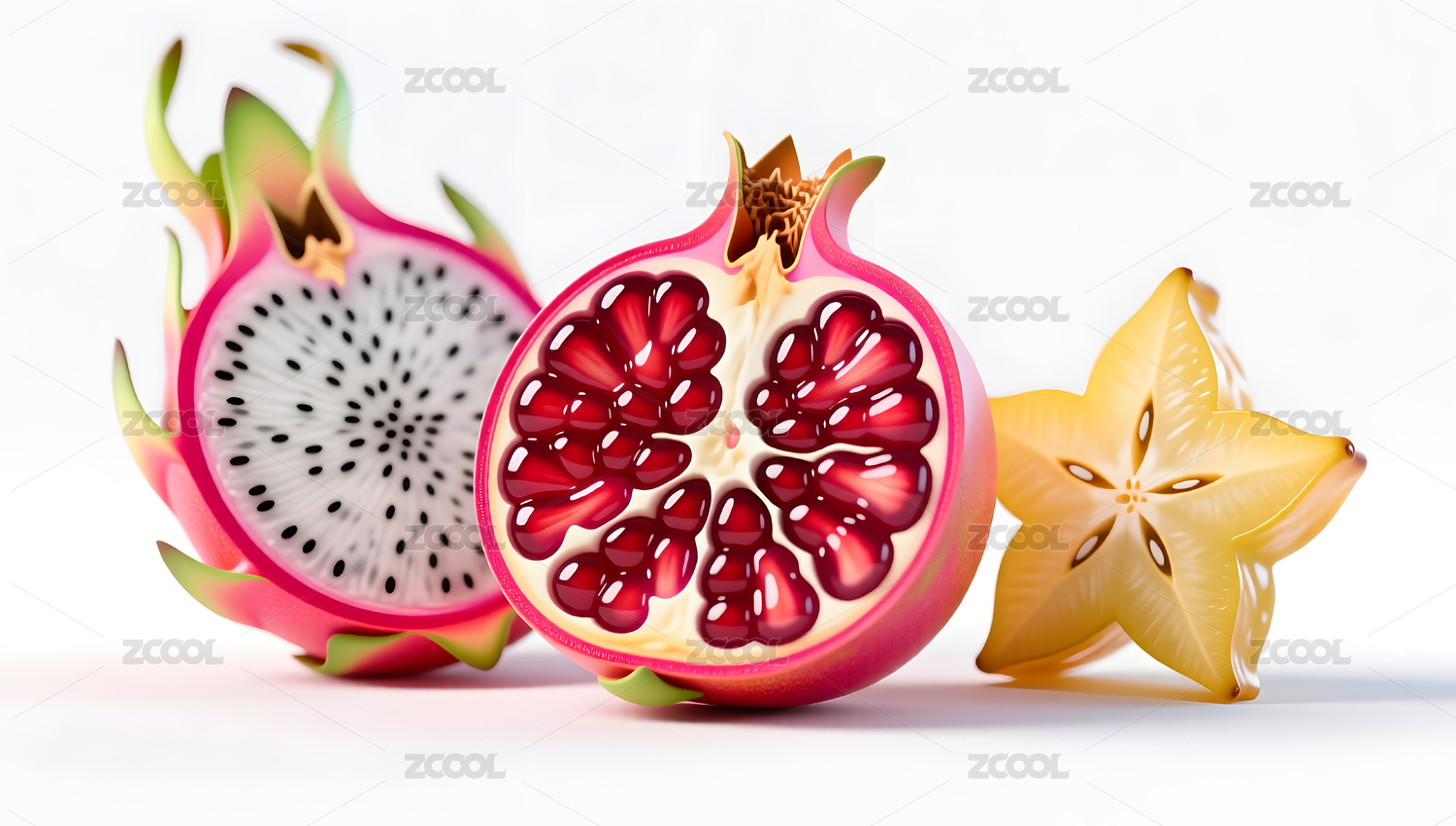 火龍果石榴與楊桃的精美水果切面圖