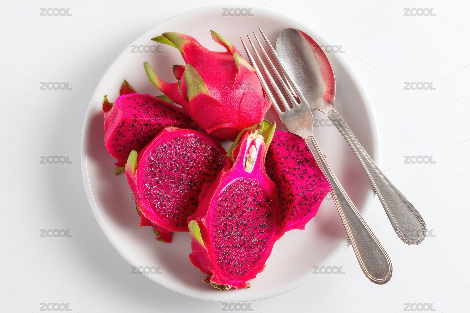 鮮紅火龍果切片與餐具的精美組合