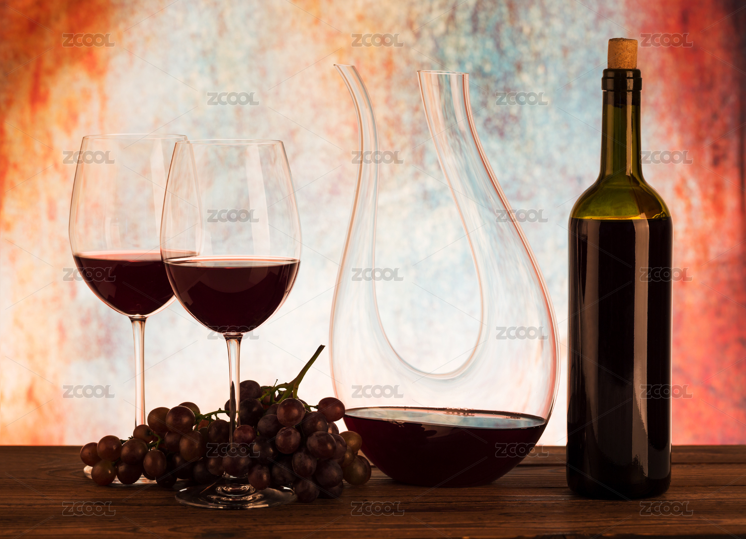 醒酒器里的紅酒和新鮮的葡萄,以及兩杯紅酒在桌子上