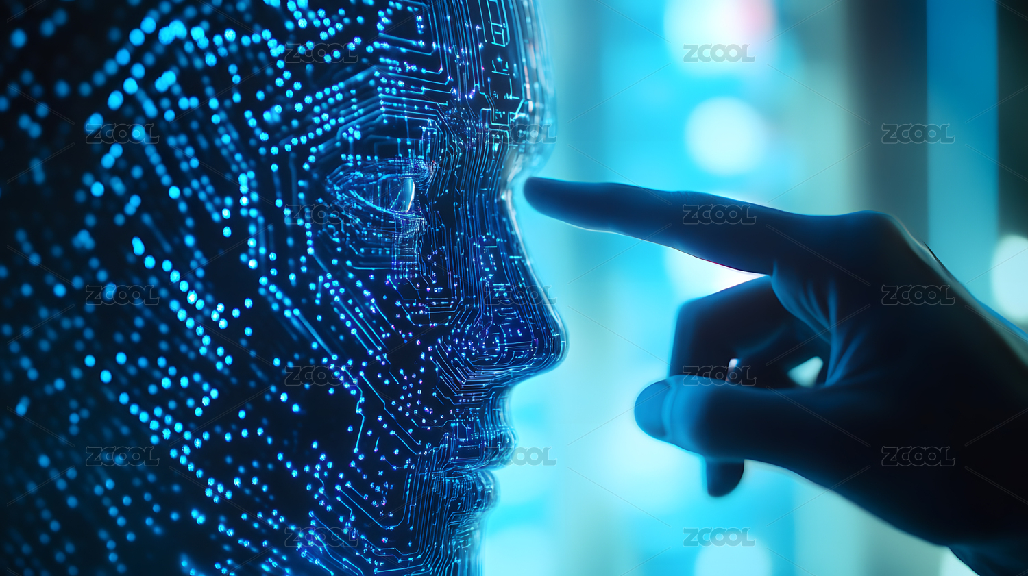一只手觸碰著全息投影下的機器人臉