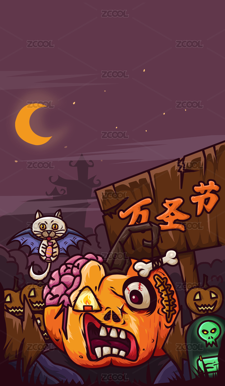 萬圣節(jié)南瓜裝扮骷髏頭矢量潮流插畫