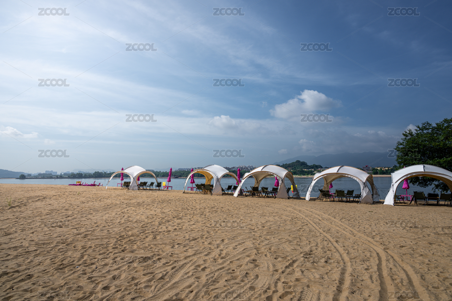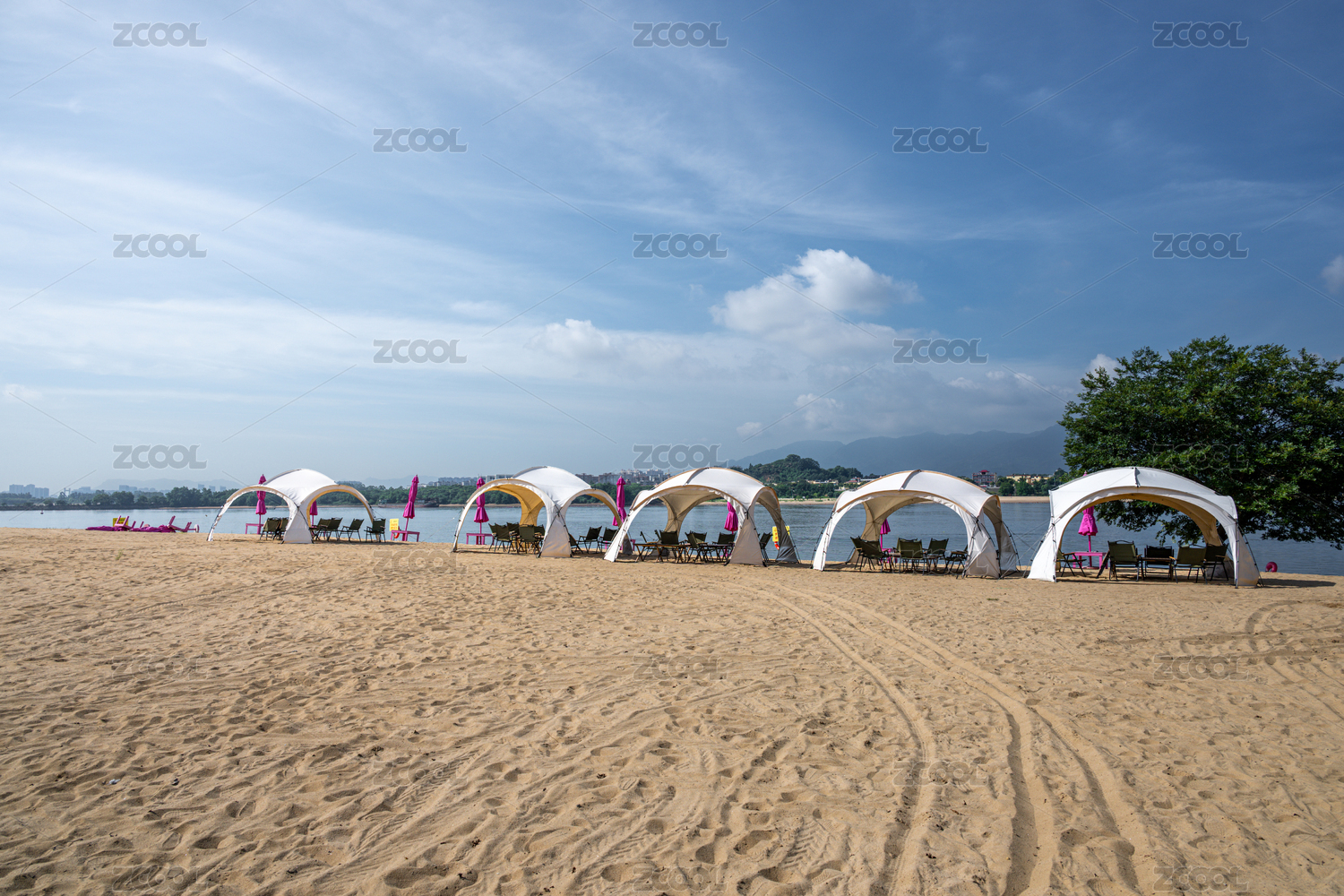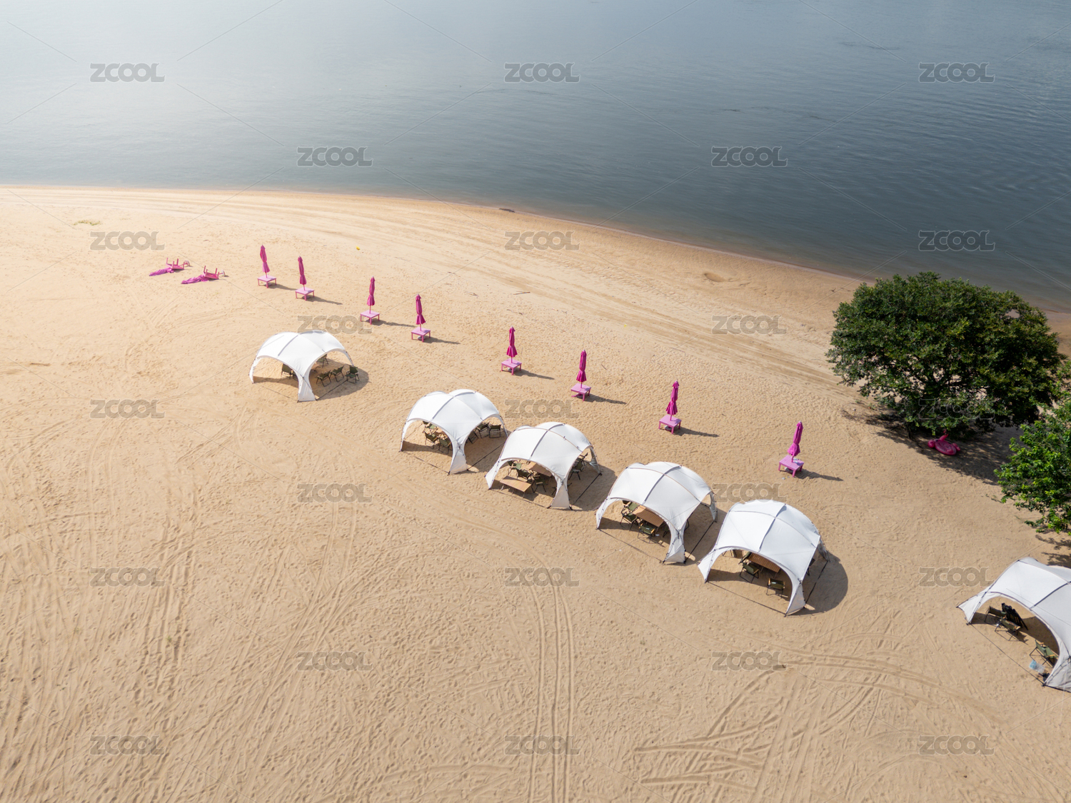 沙灘上的白色帳篷和粉色遮陽(yáng)傘
