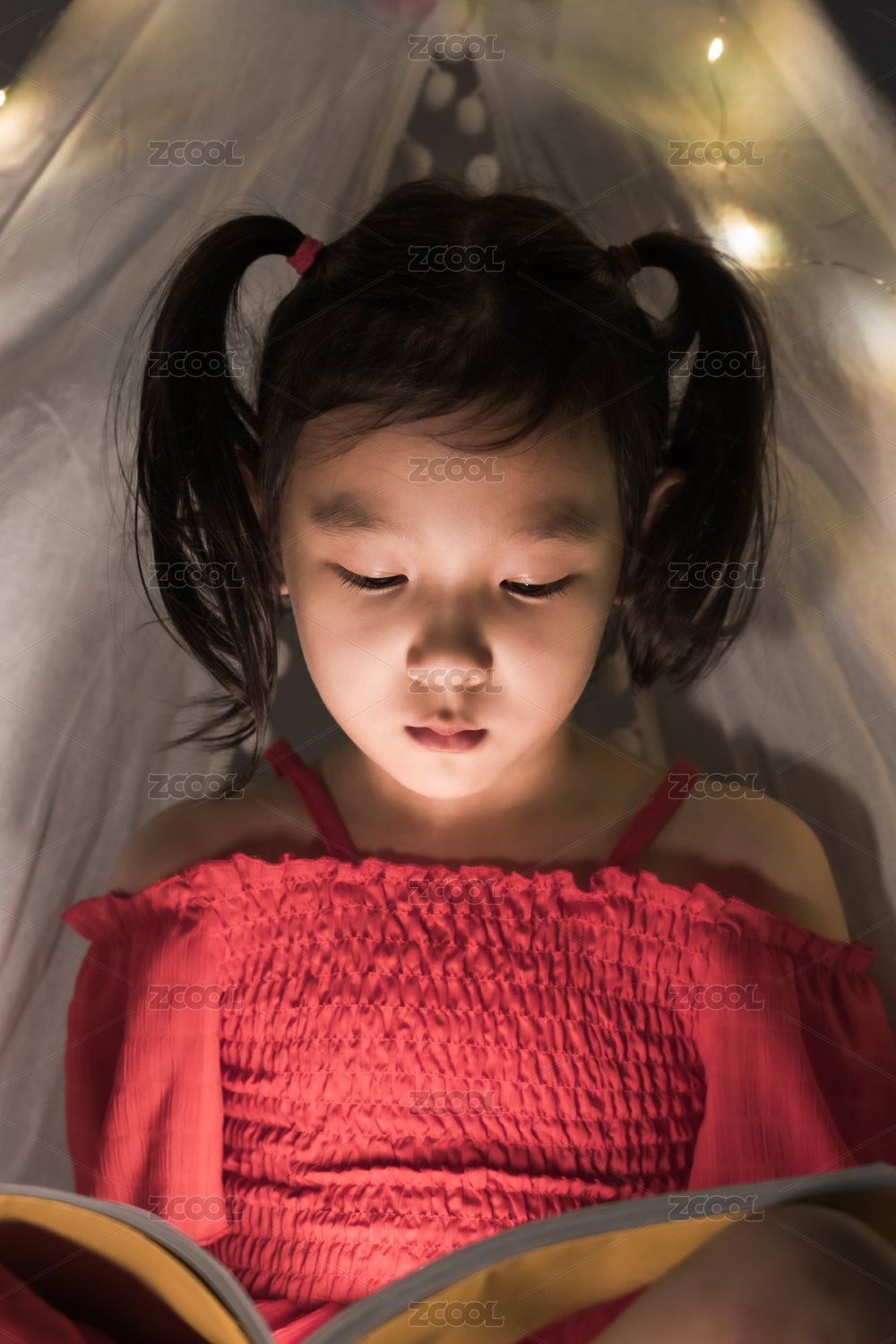 夜晚在白色帳篷里讀書(shū)的女孩
