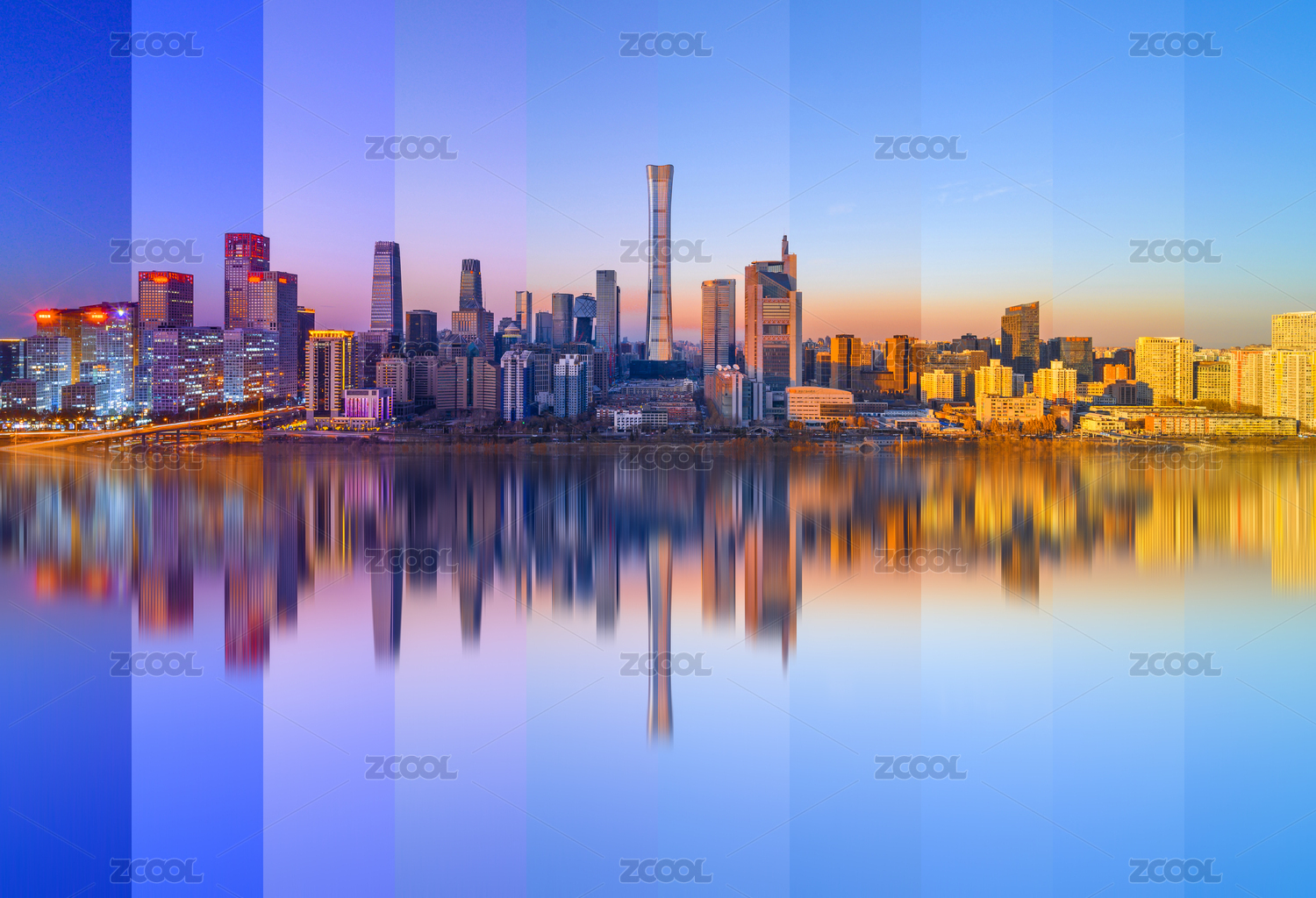 北京國(guó)貿(mào)城市天際線日轉(zhuǎn)夜時(shí)間切片倒影風(fēng)光