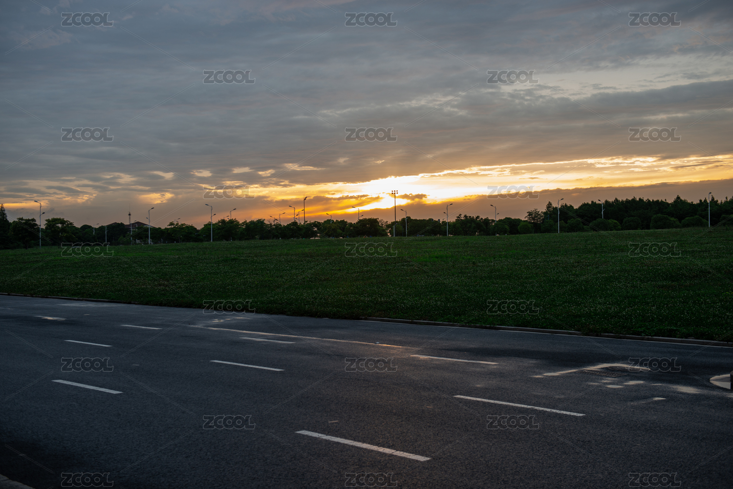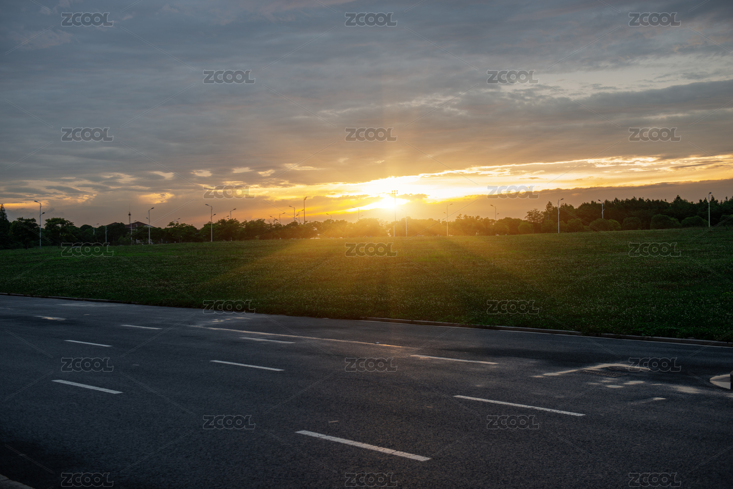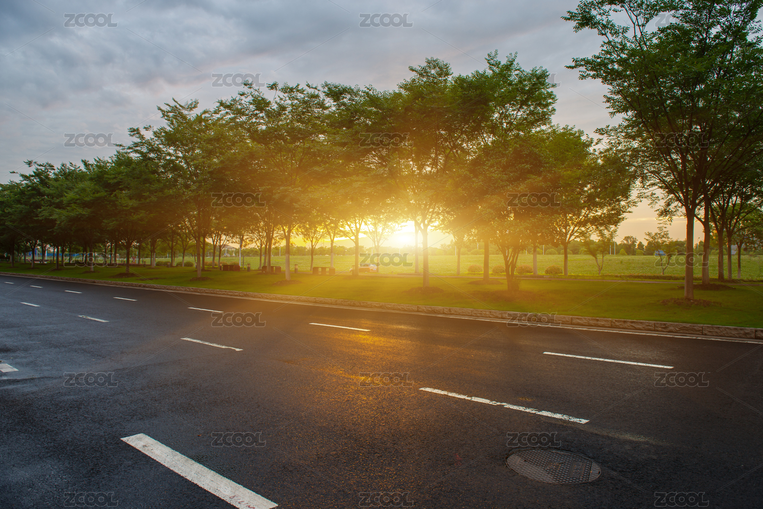 傍晚晴朗天空,城市有交通引導(dǎo)線的柏油馬路