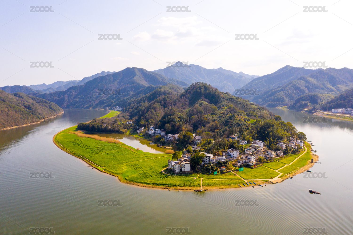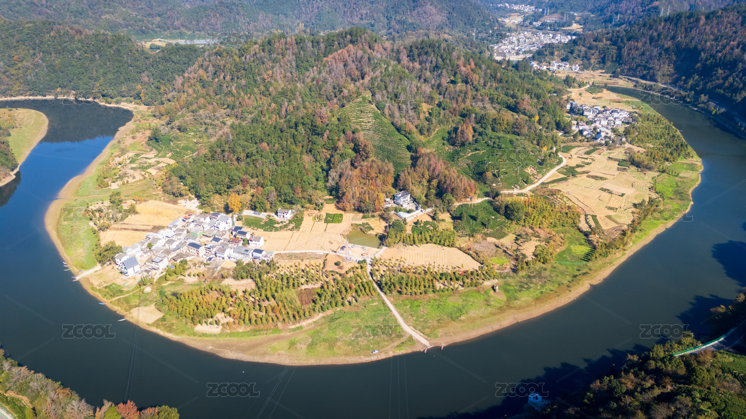 航拍徽州新安江青山綠水鄉(xiāng)村田園