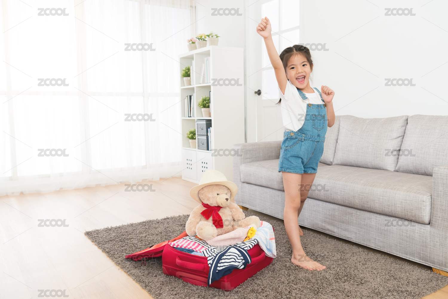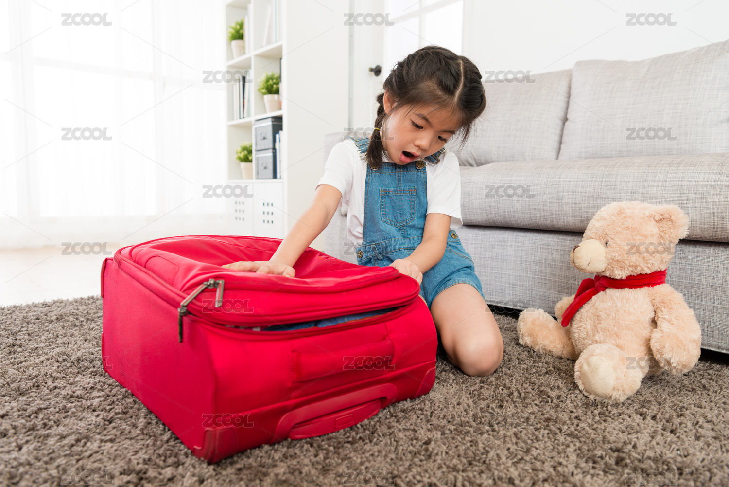 開朗可愛的小女孩收拾完客廳個(gè)人行李箱,使冒充準(zhǔn)備攜帶的玩具熊去旅行。