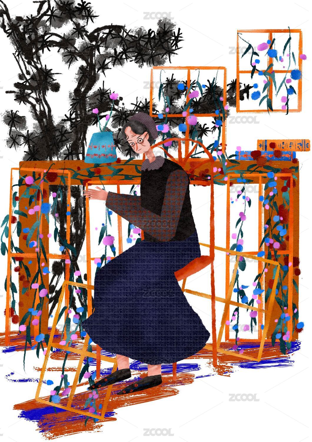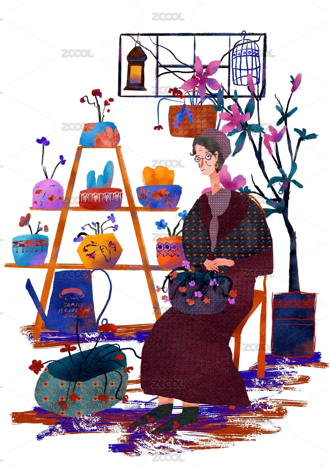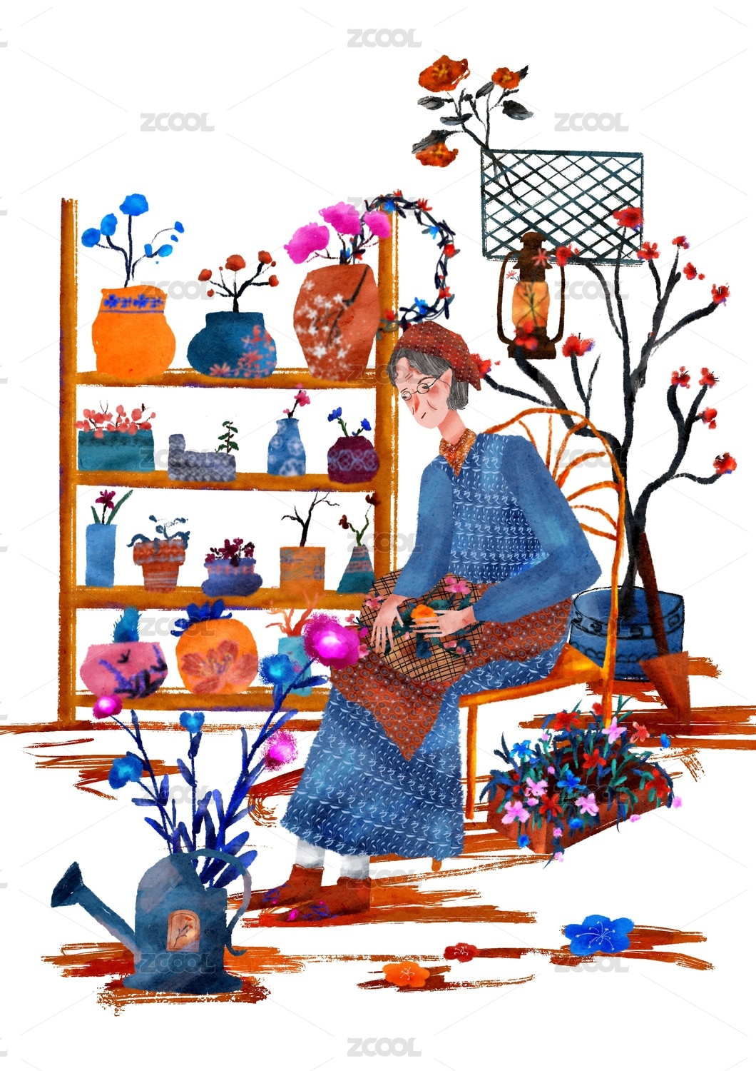 奶奶在小花園收拾自己的鮮花-水彩畫