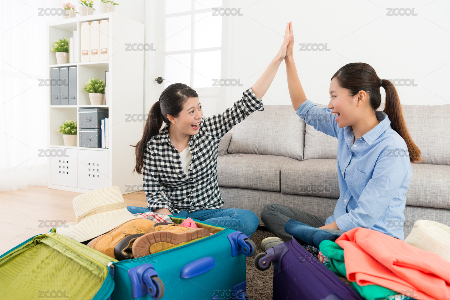 開朗快樂的姐妹們相互擊掌,當(dāng)他們收拾完行李準(zhǔn)備前往享受暑假。