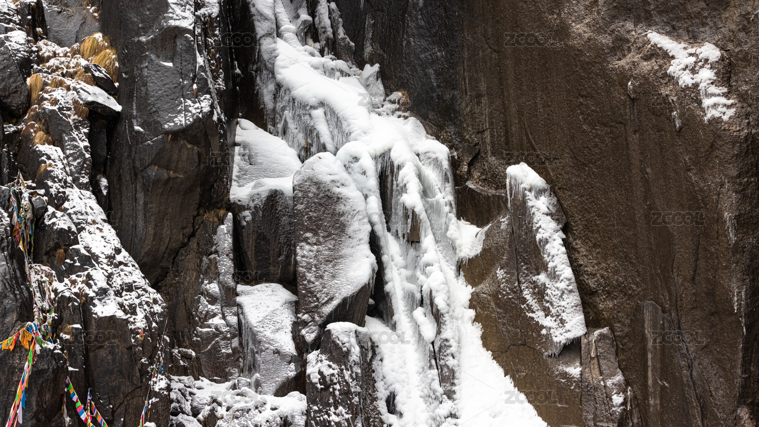 云南迪慶雨崩冬季神瀑巖壁冰掛