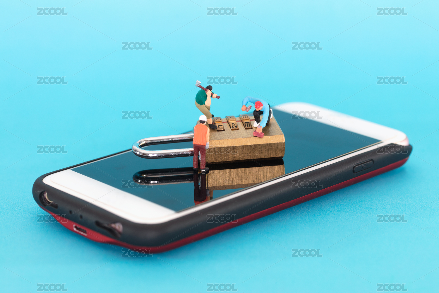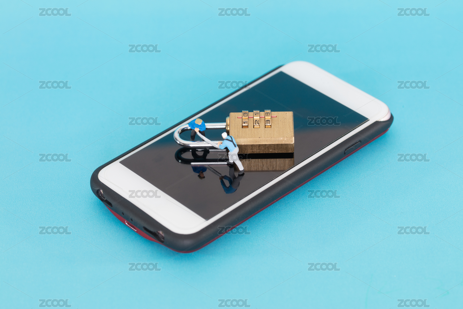 微縮攝影人偶試圖打開手機上的密碼鎖
