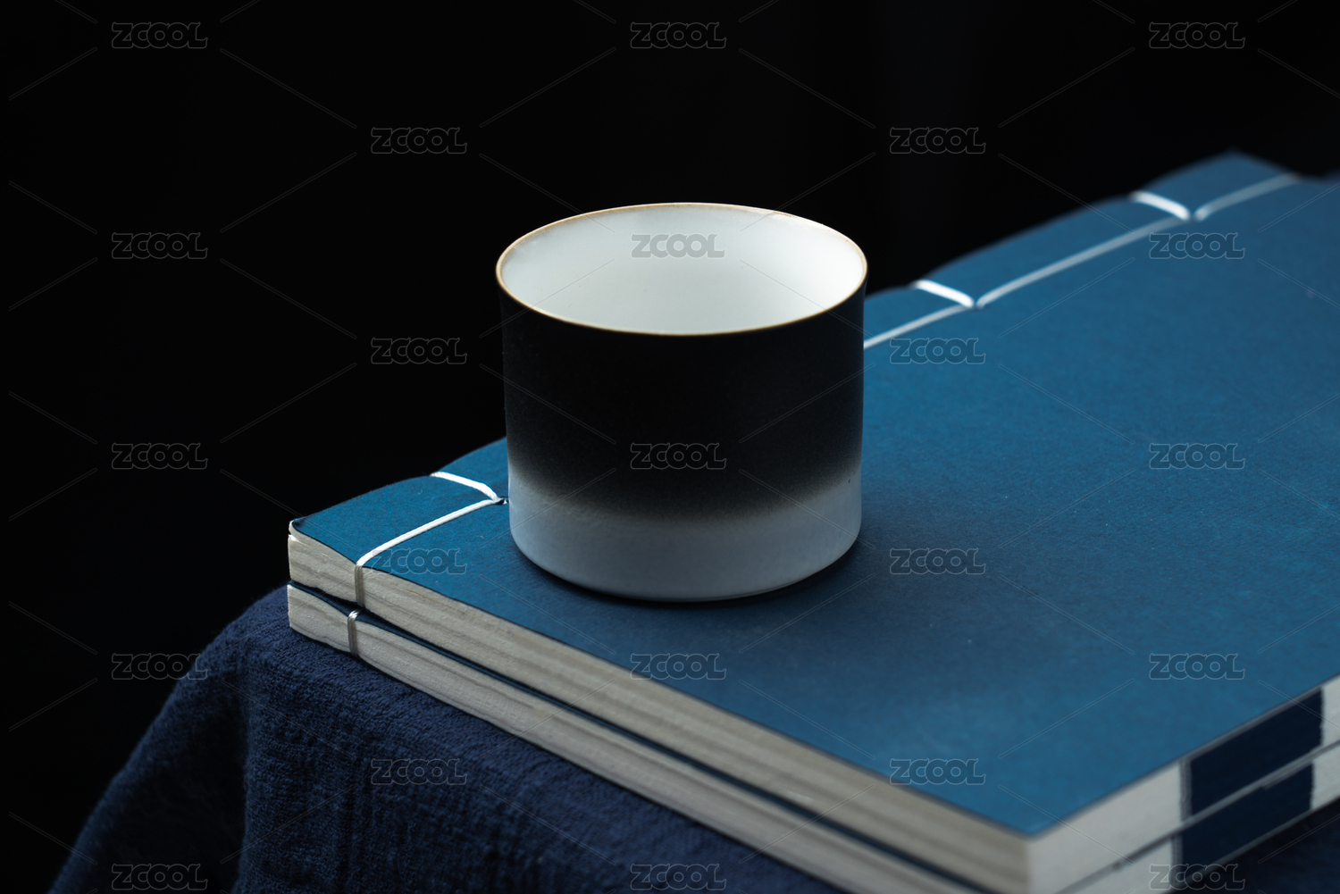 中國(guó)畫風(fēng)格,茶簾下面的桌面上放著一摞線裝書和一件手工藝品