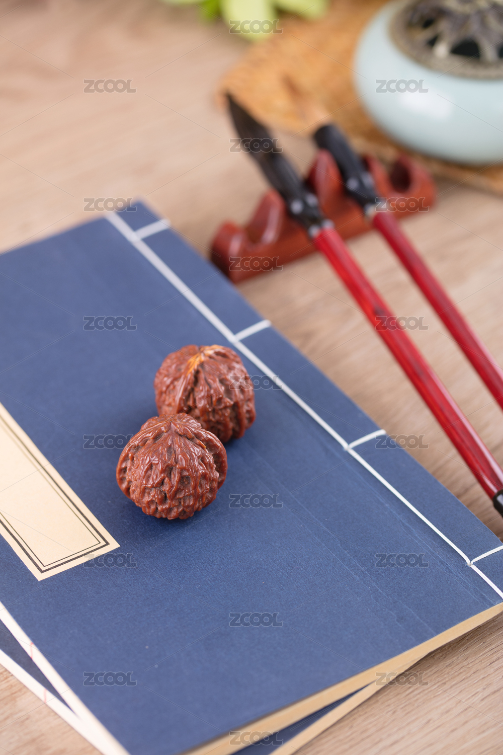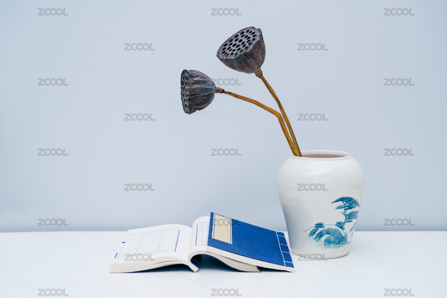 中式家居陳設(shè)古典線裝書和枯萎的蓮蓬