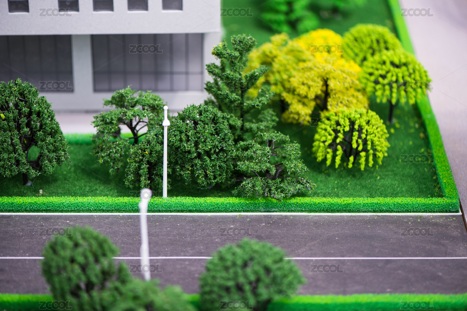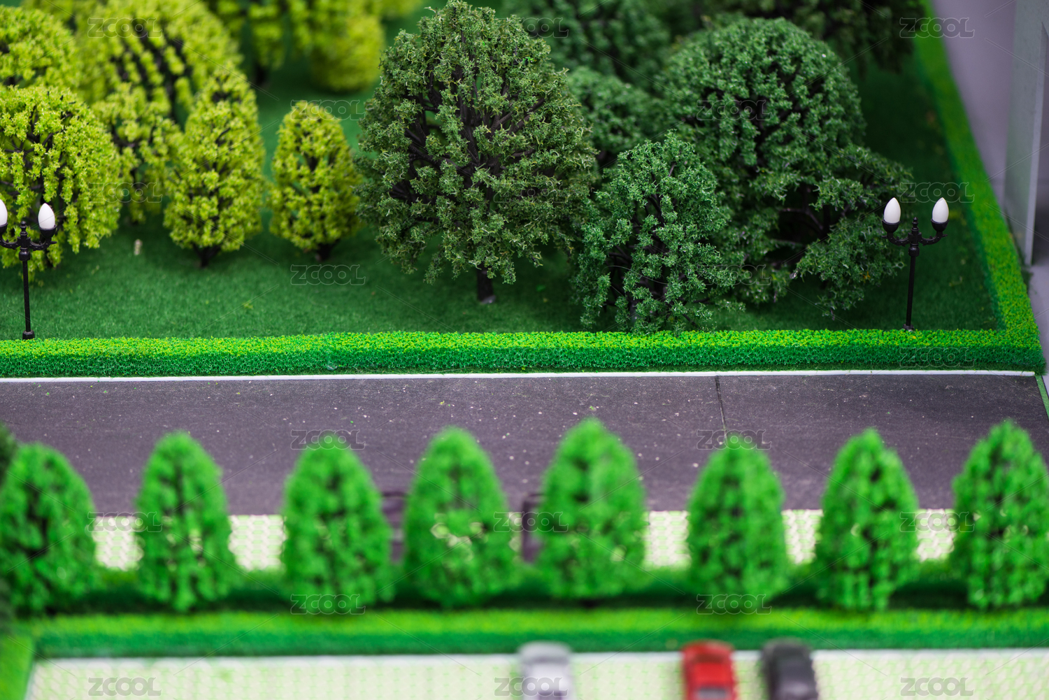 房產(chǎn)沙盤里有汽車行駛的道路及綠地行道樹等模型