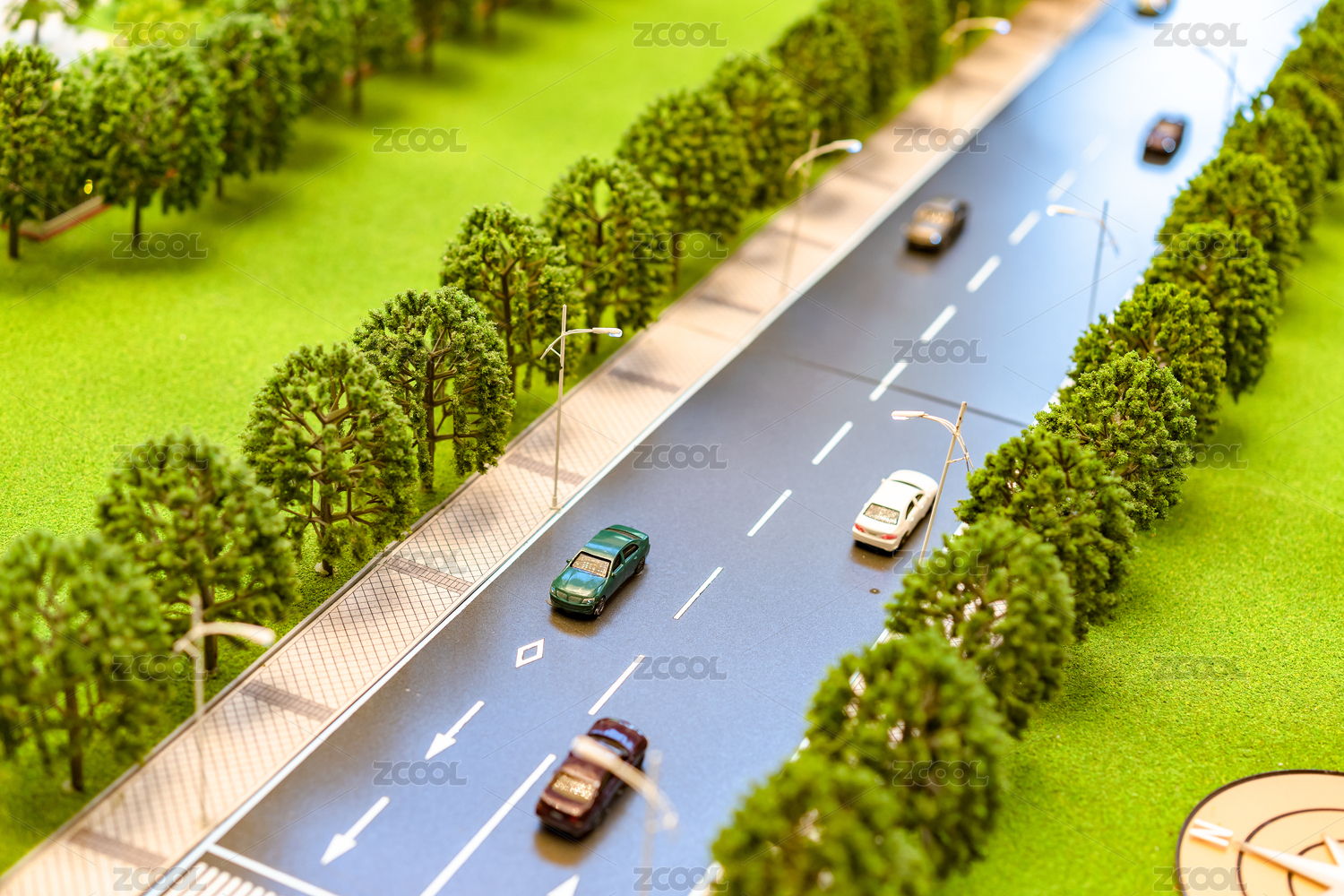 沙盤里有汽車行駛的道路及行道樹綠地樓房等模型