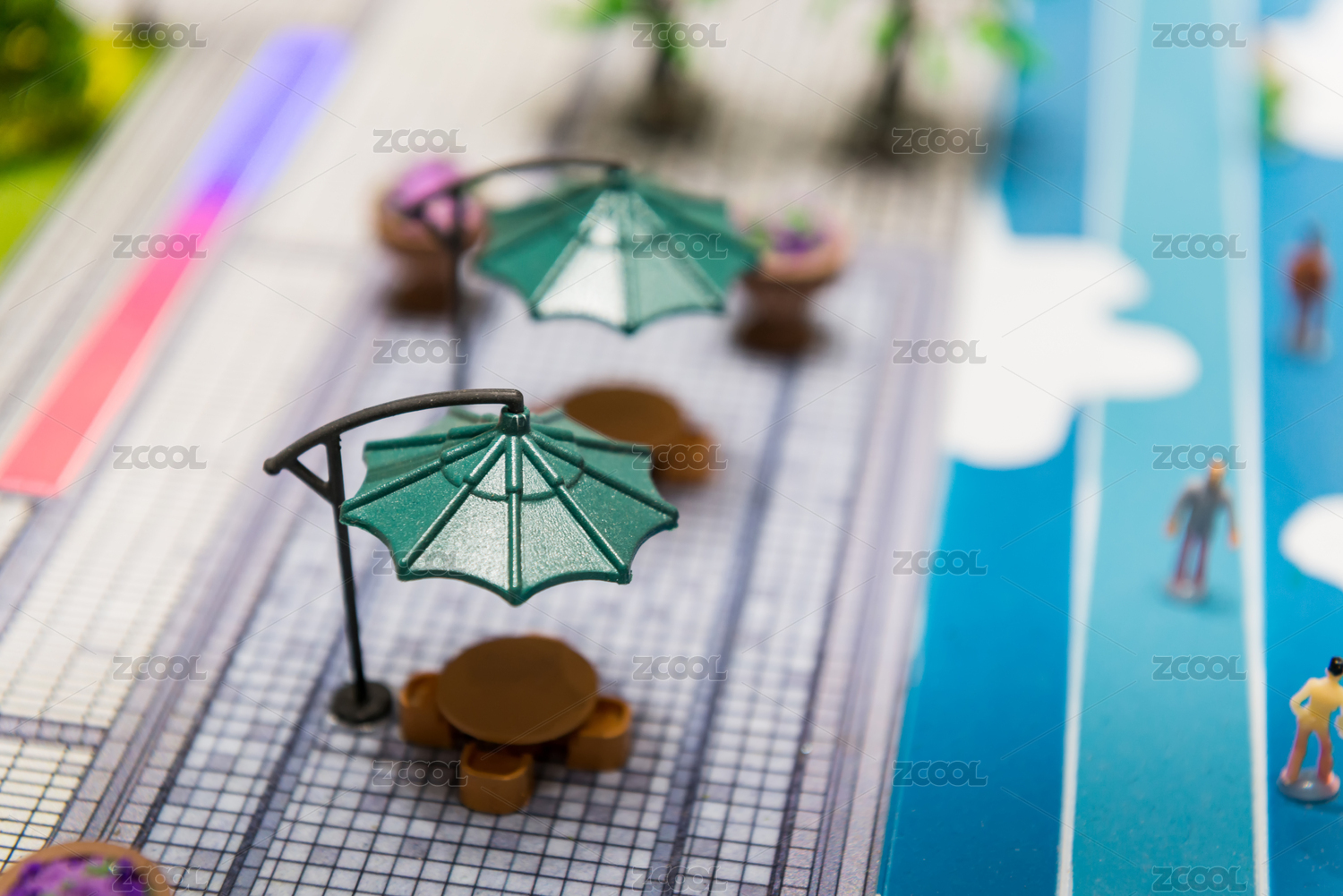房地產(chǎn)售樓處建筑模型沙盤中住宅小區(qū)休閑區(qū)建筑規(guī)劃場(chǎng)景太陽傘桌椅局部特寫