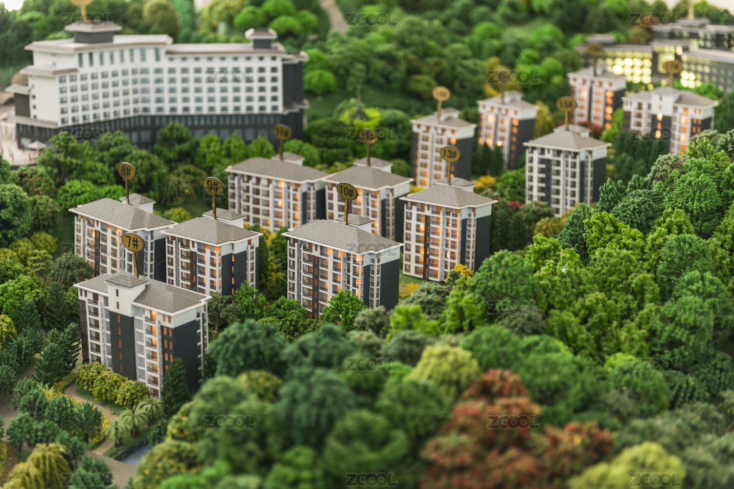 房地產(chǎn)售樓處建筑模型沙盤中高層住宅小區(qū)規(guī)劃場(chǎng)景局部特寫