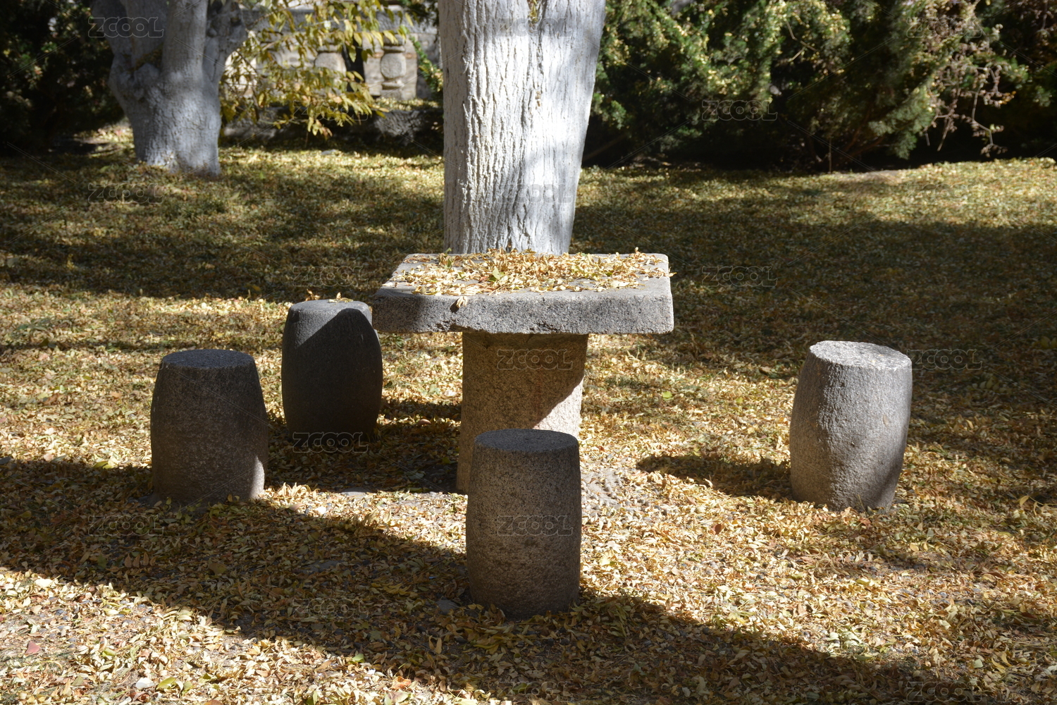 石桌石凳與落葉