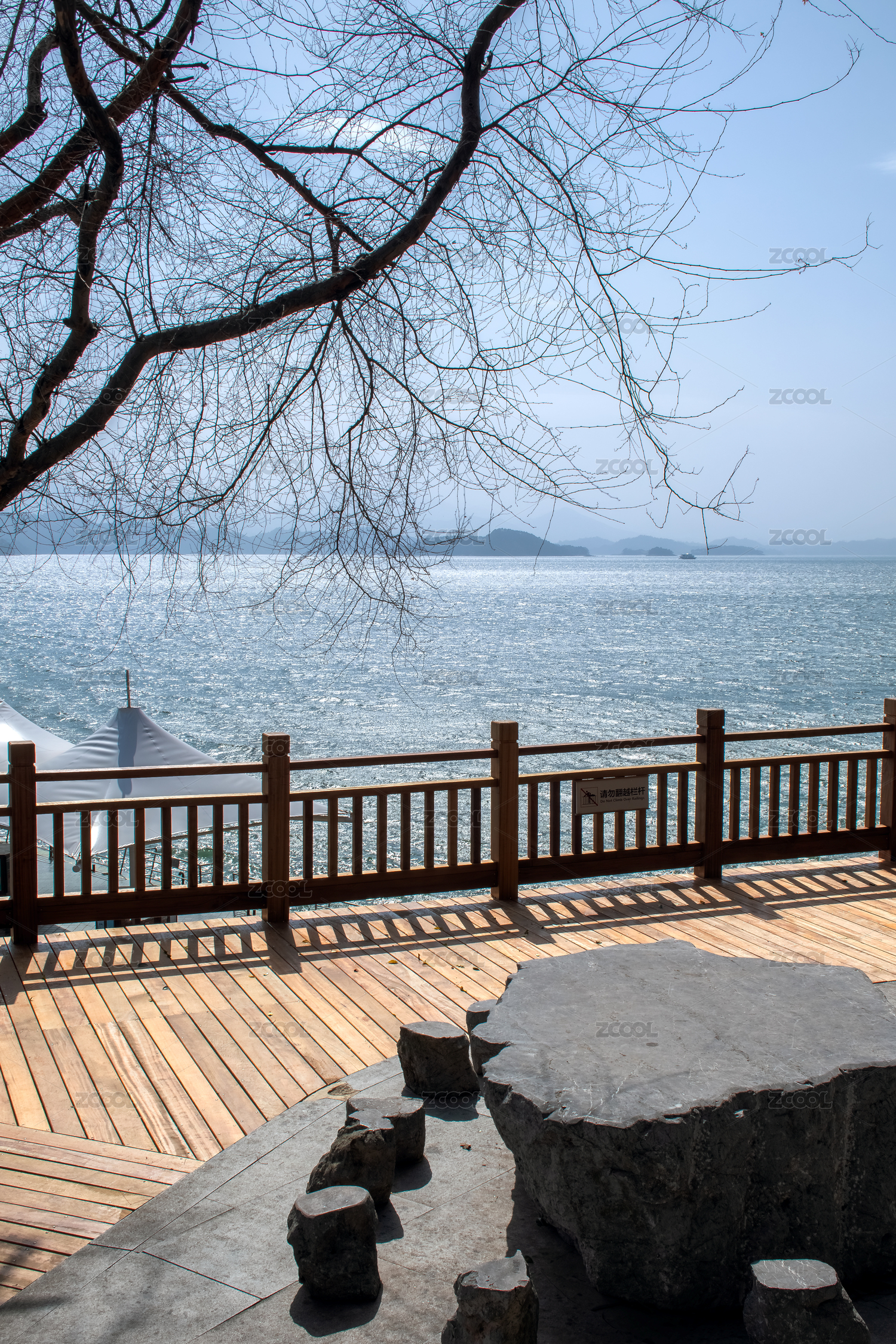 湖邊無人的石桌石凳