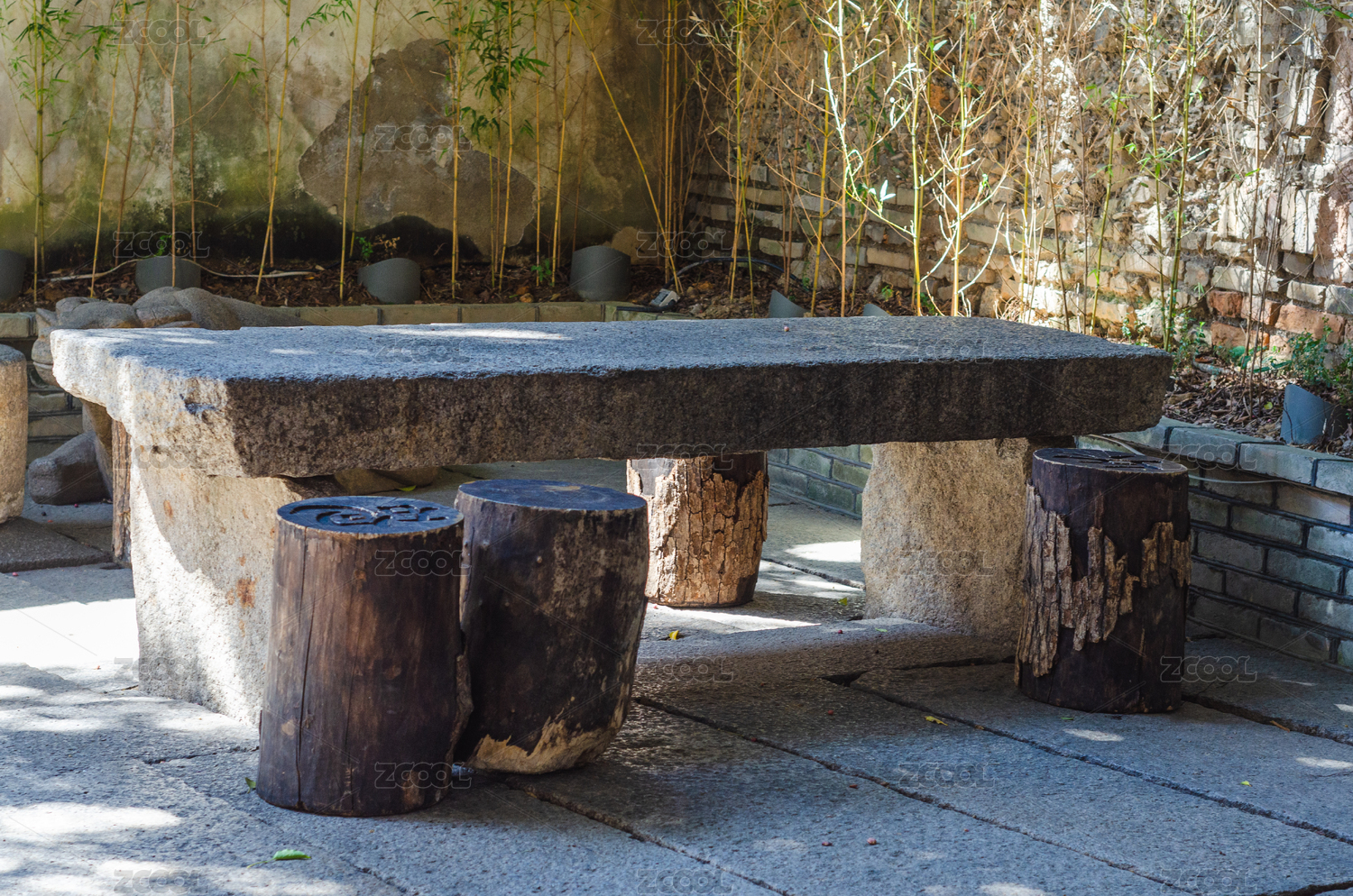 院中一角竹子石桌