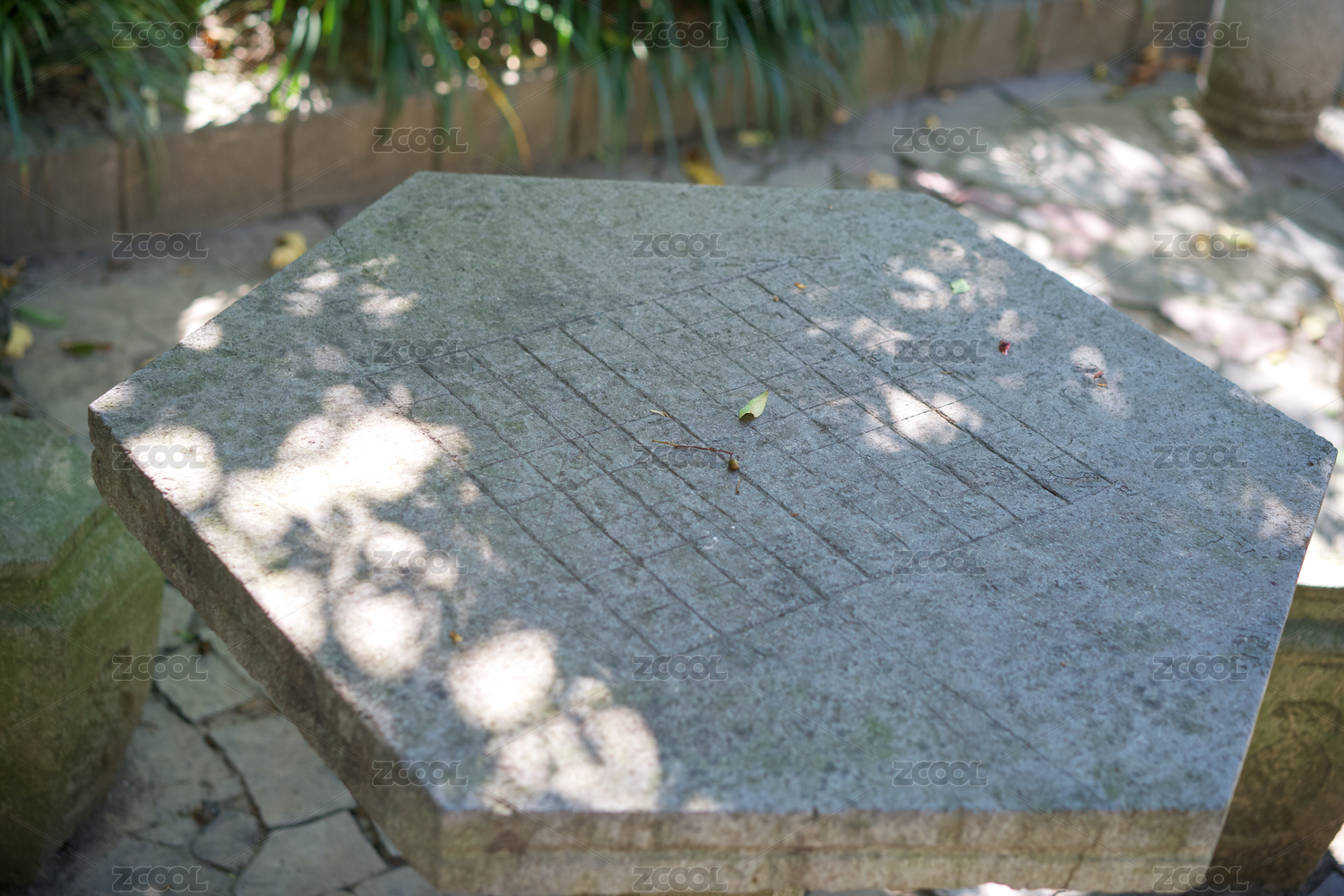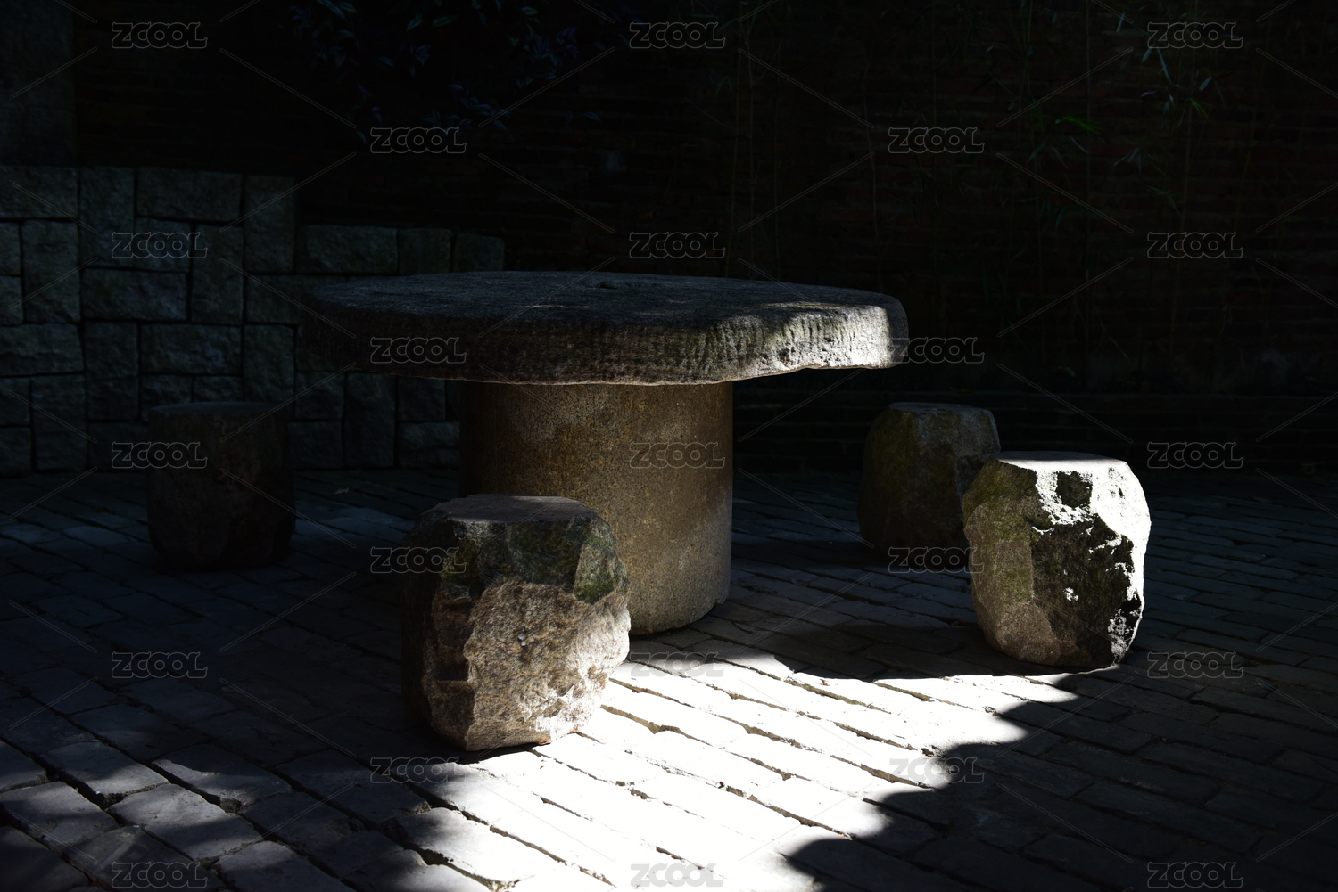 一縷陽光斜照下的青石桌凳