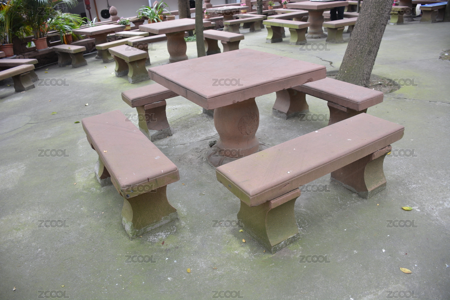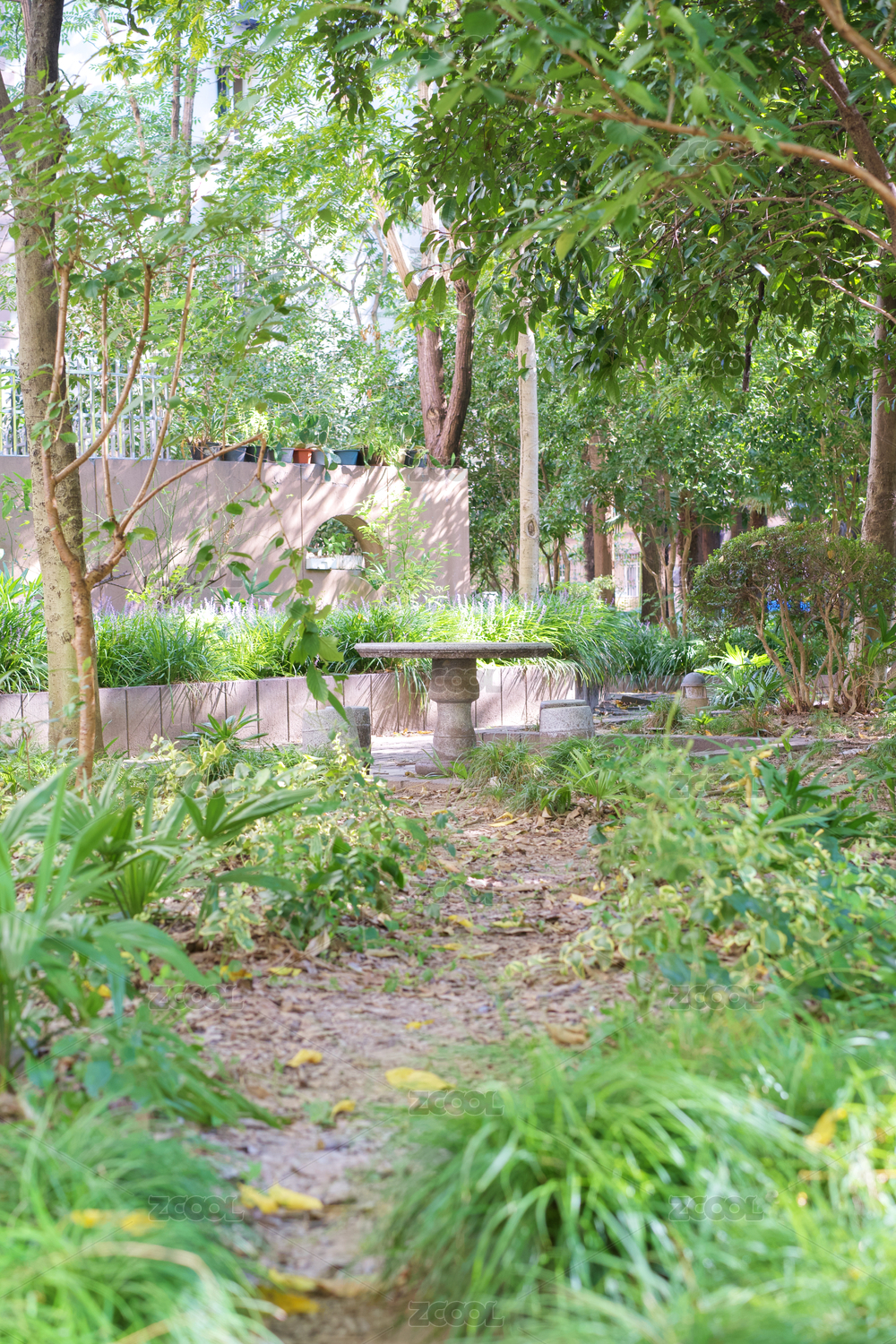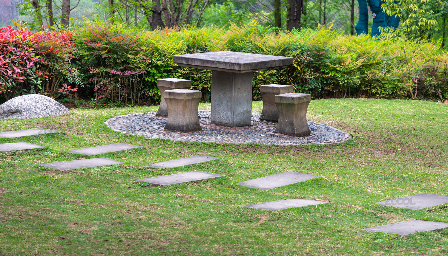公園一角的石桌石凳綠植