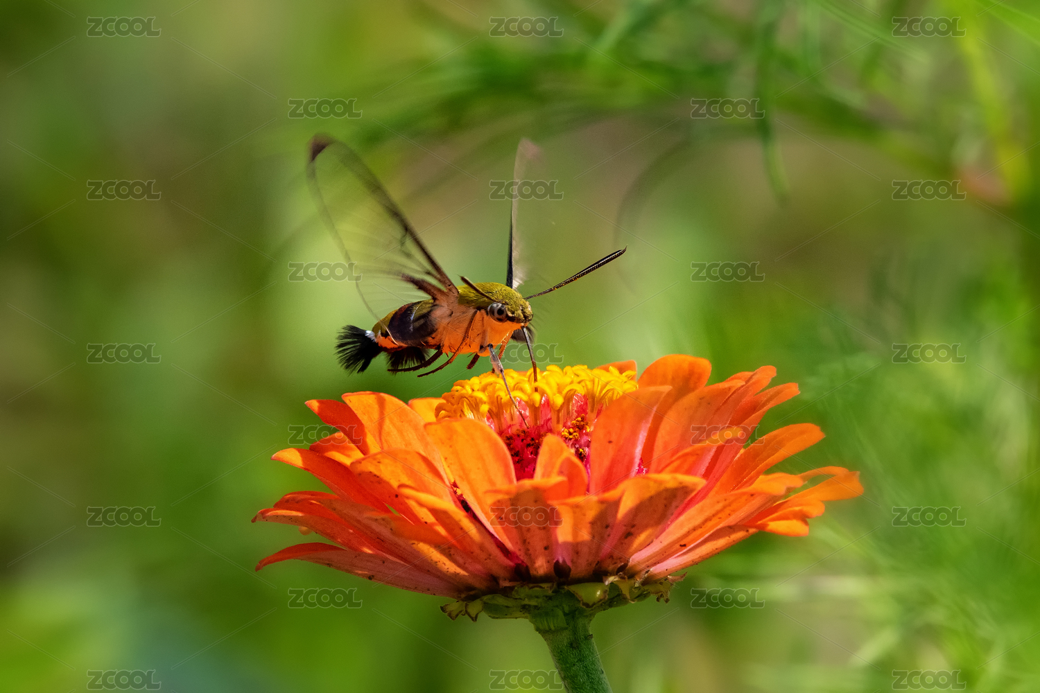中國上海世紀公園的蜂鳥鷹蛾與百日菊