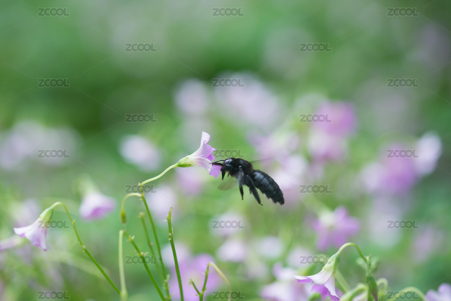 酢漿草花叢中一只黑蜂在采花蜜