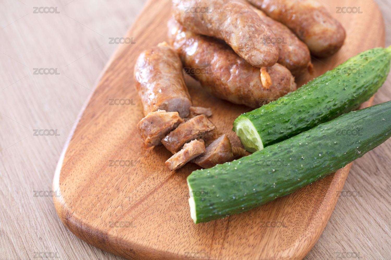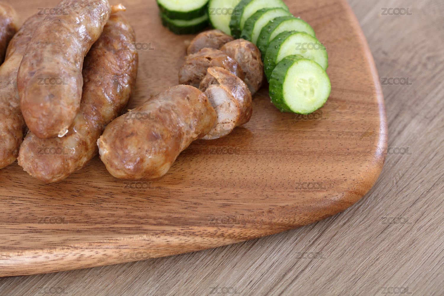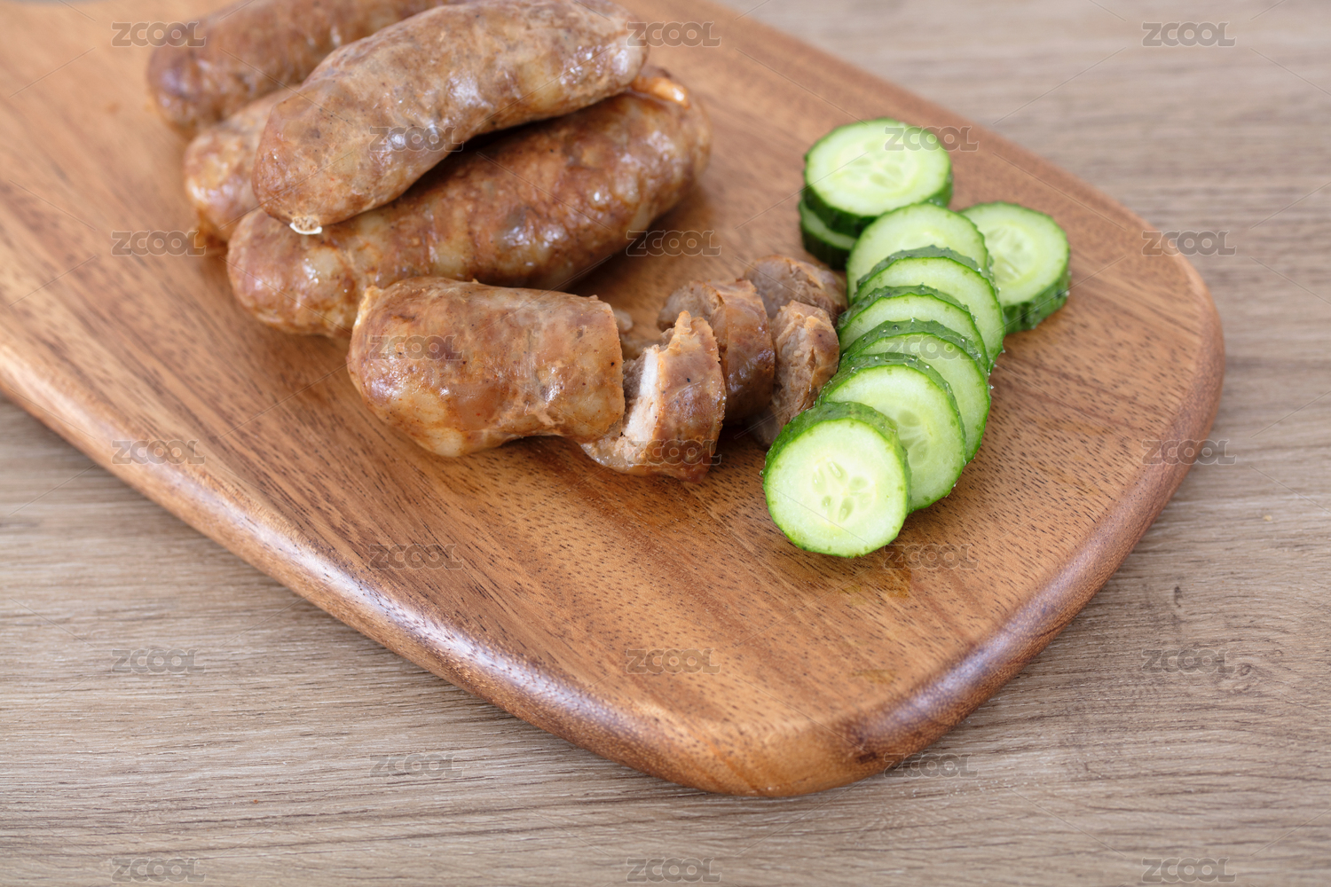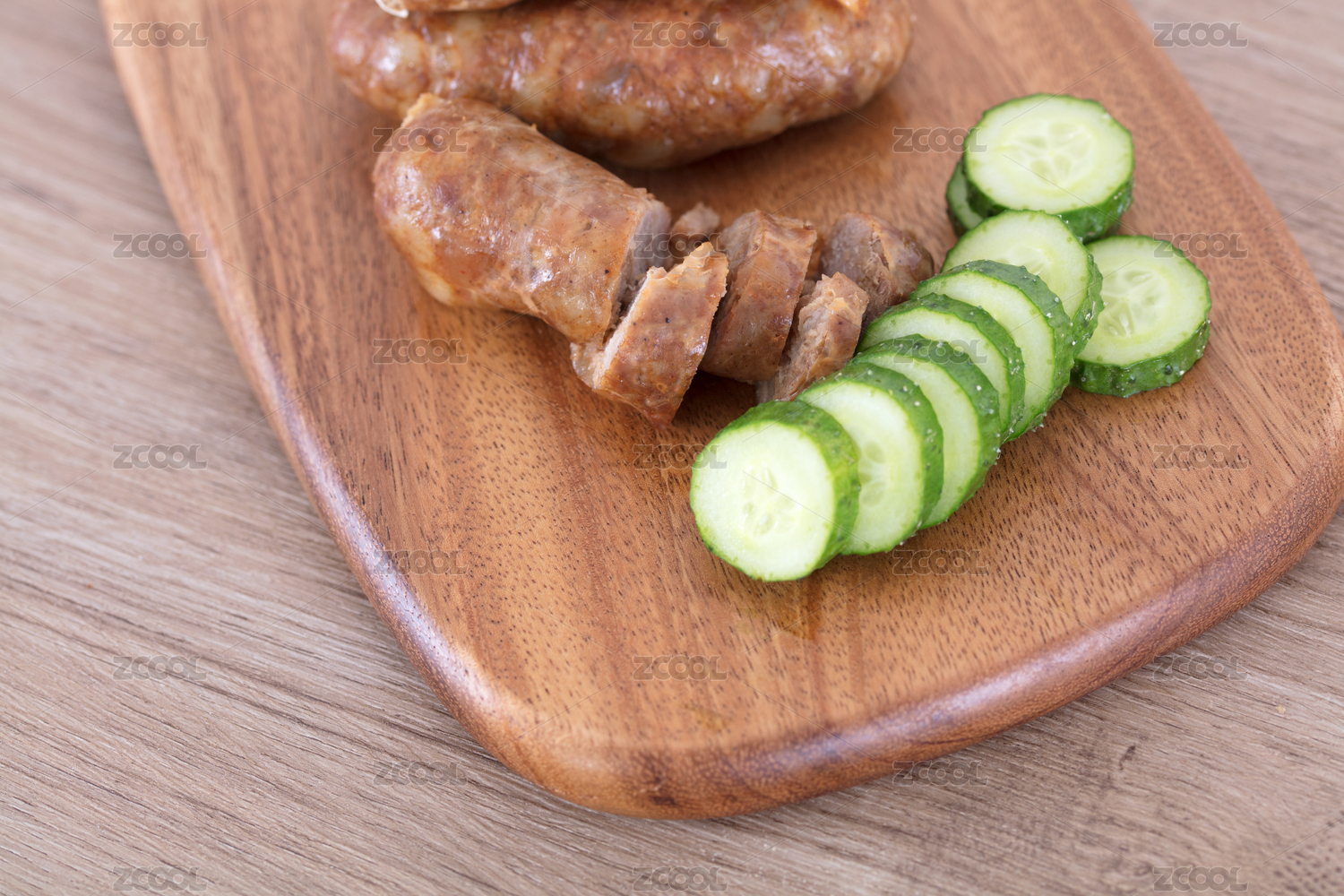 砧板上的豬肉腸和切片的黃瓜