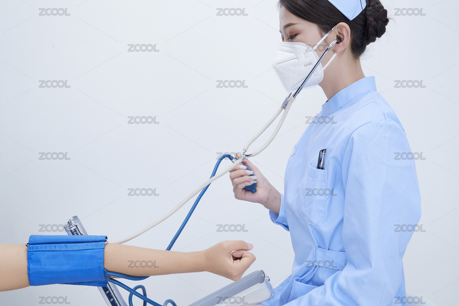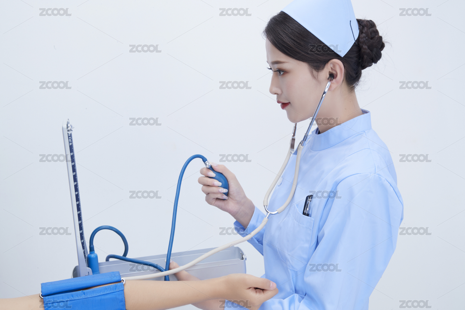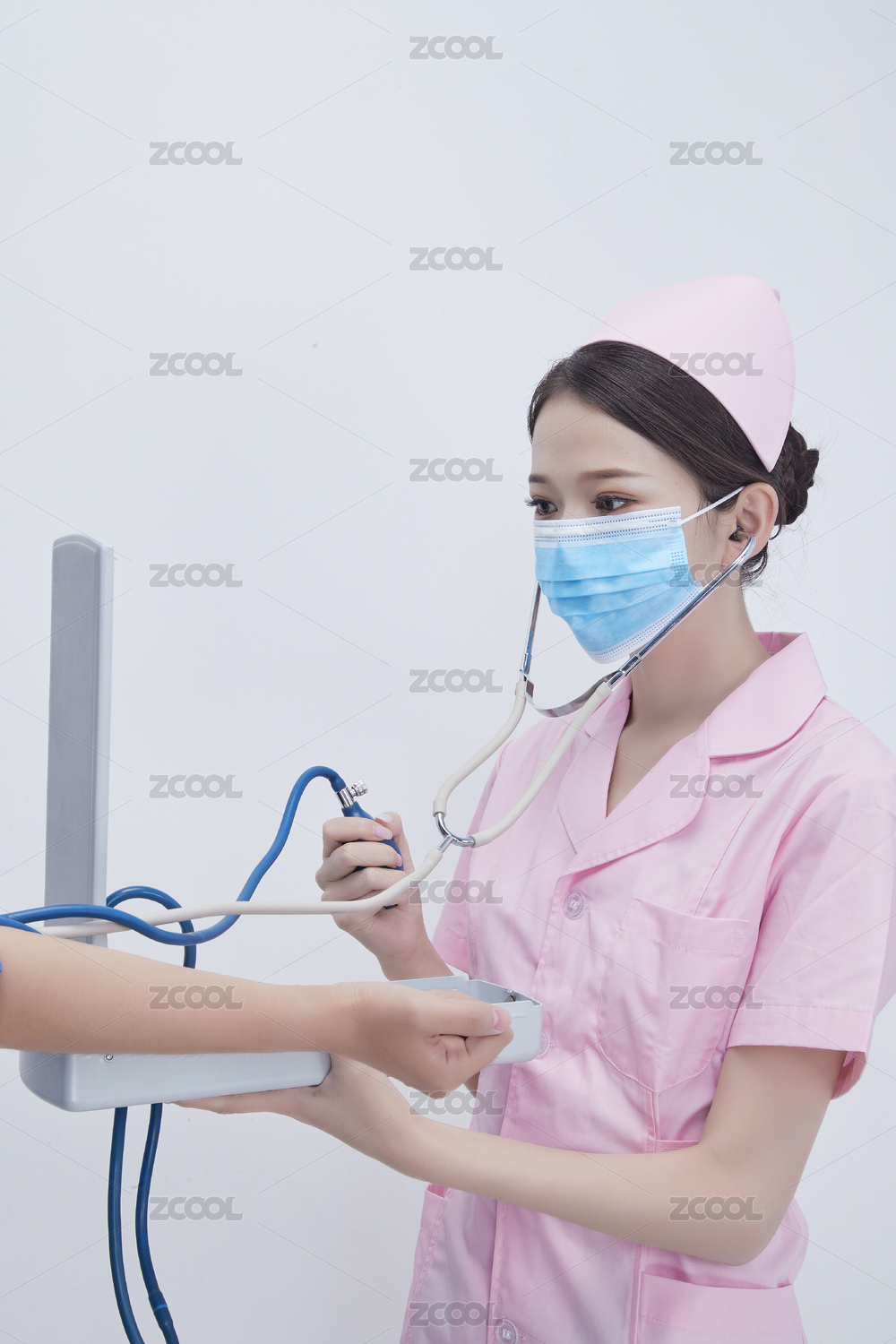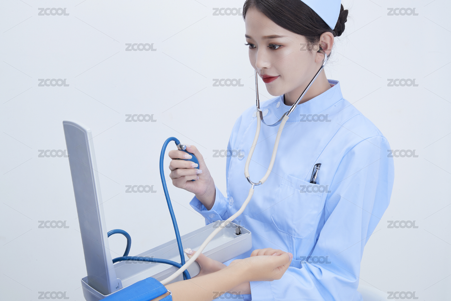 手拿血壓測量儀為患者診治量血壓的女性護士