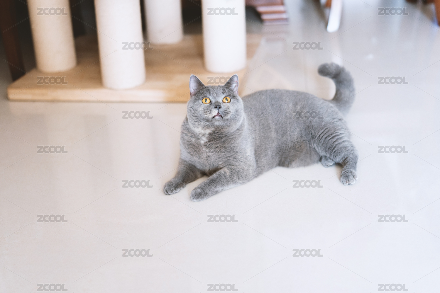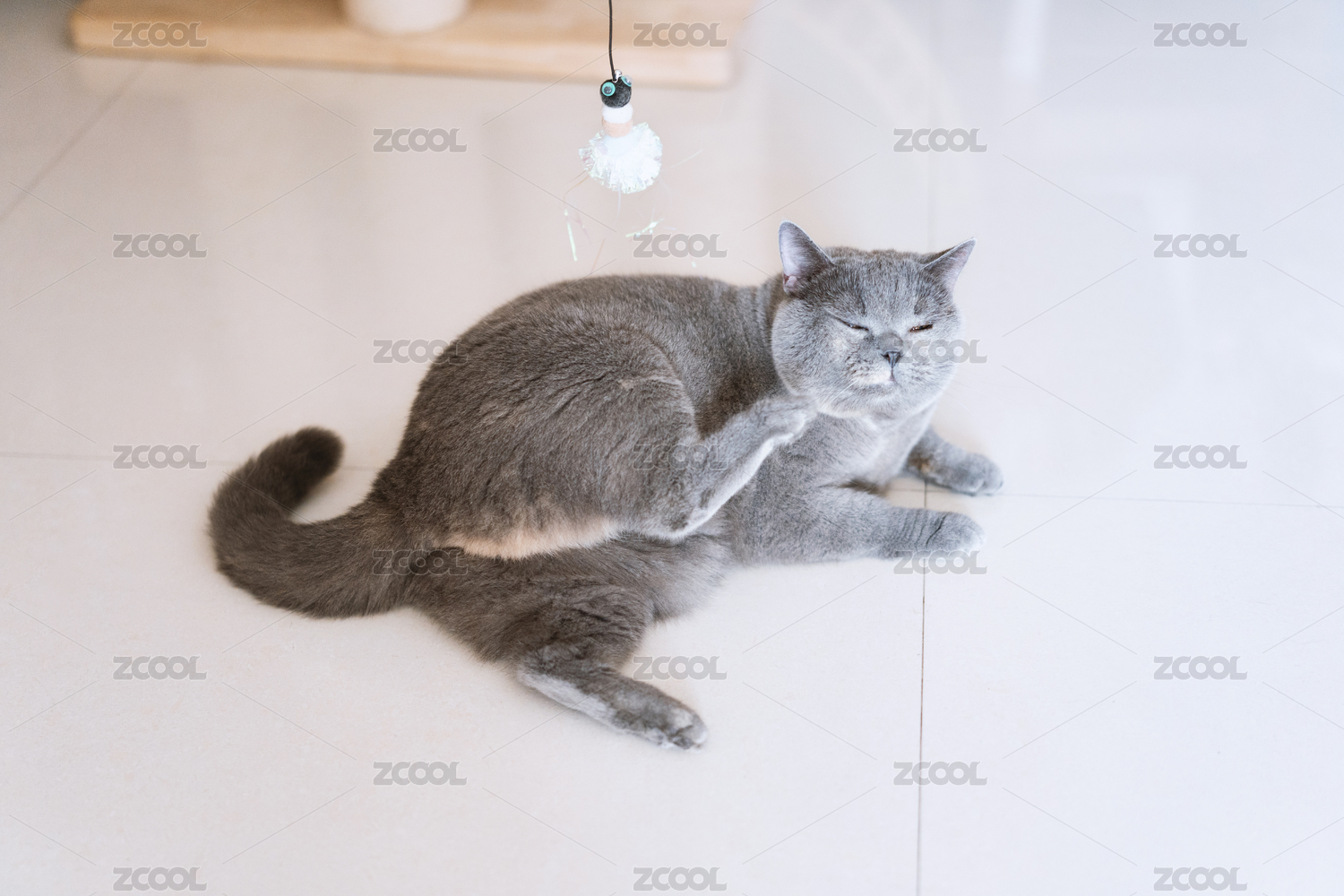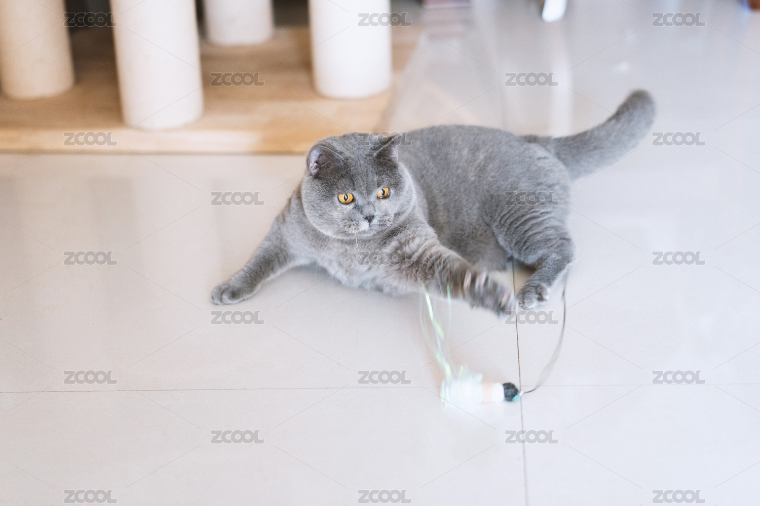 灰色的英國(guó)短毛貓藍(lán)寵物貓好奇的玩著逗貓棒