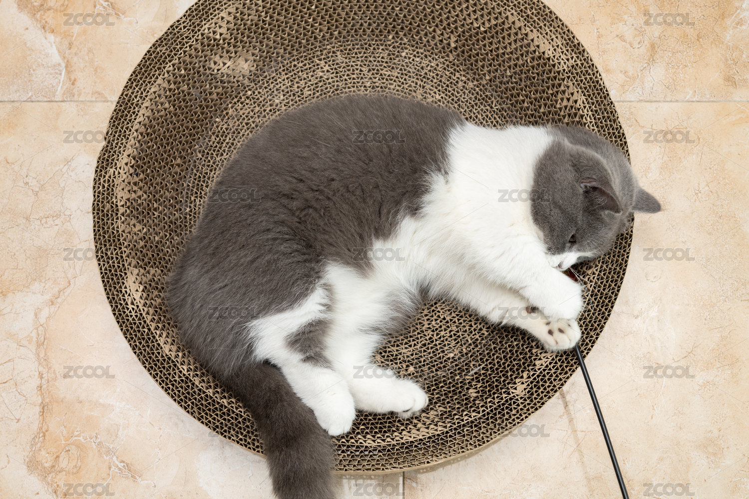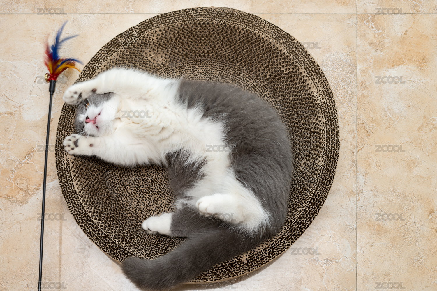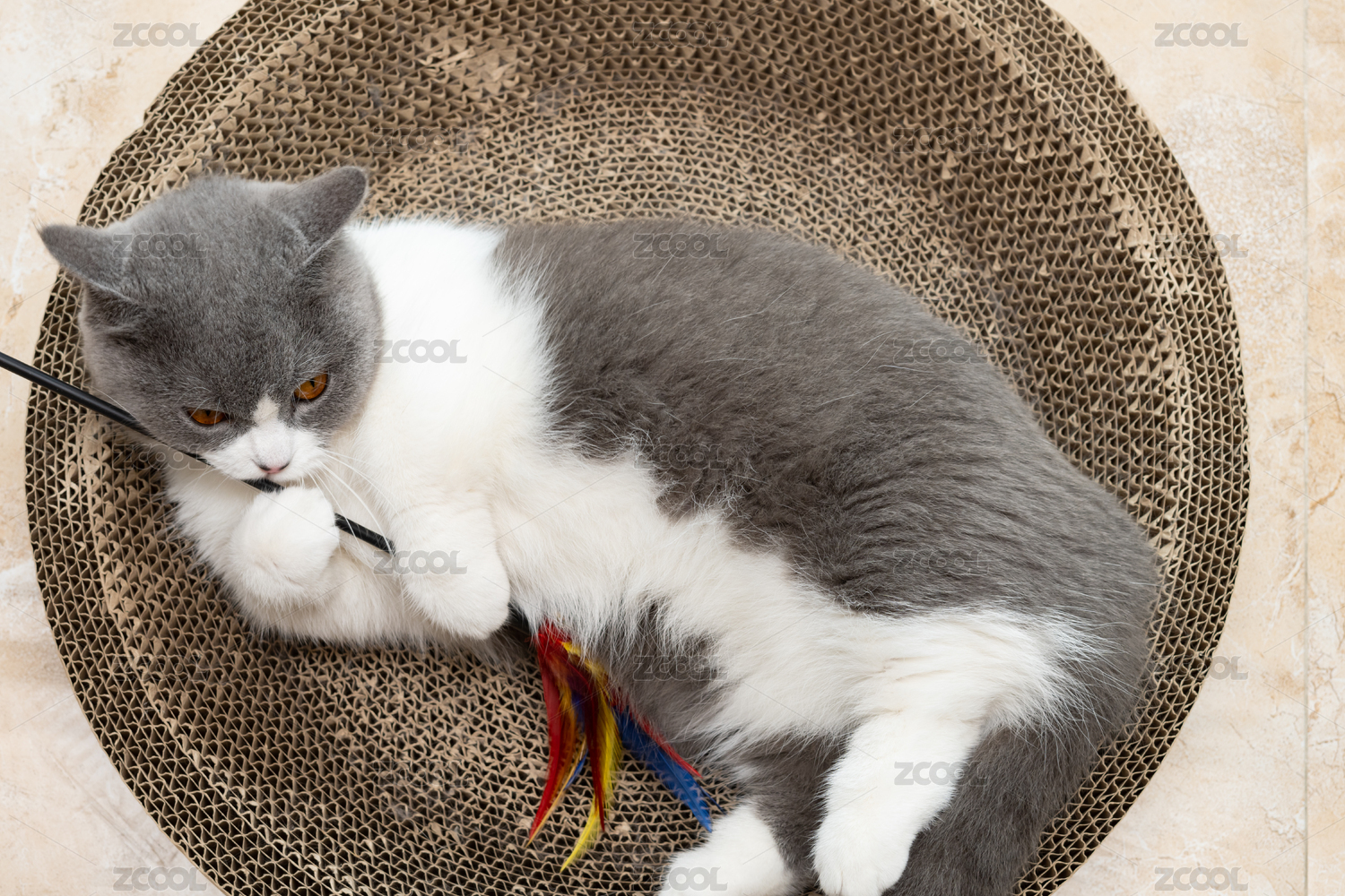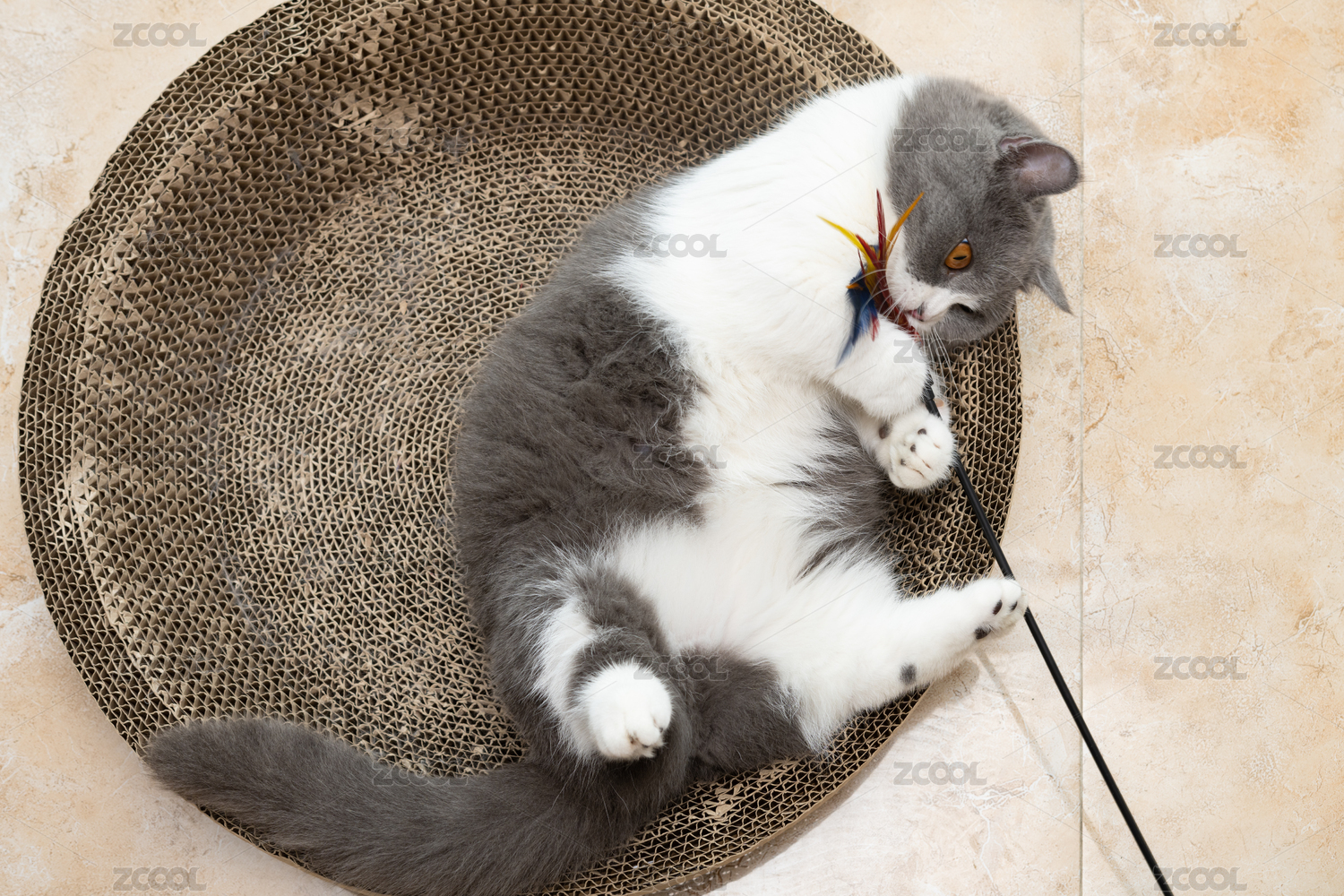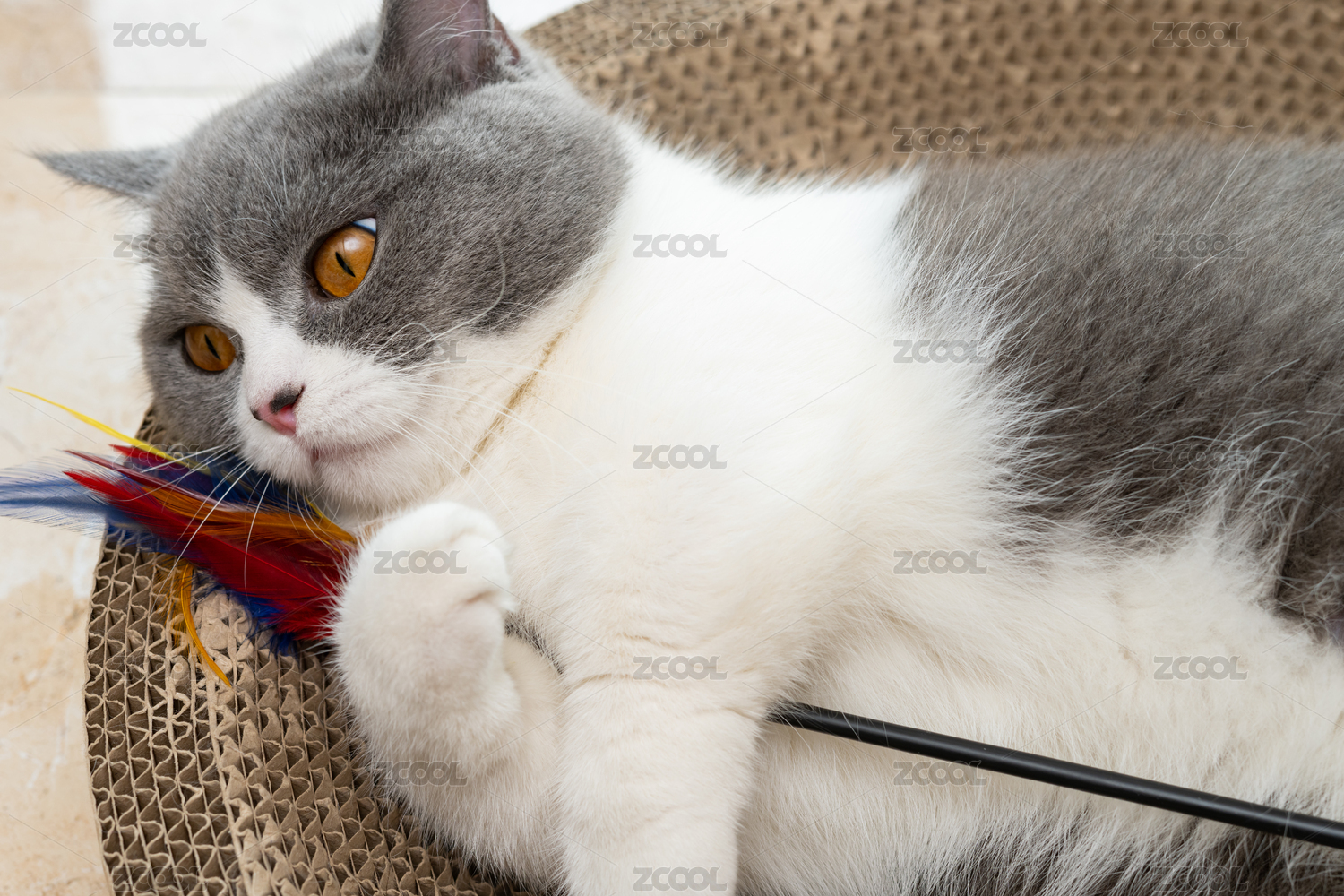 英短藍(lán)白躺在貓爪板上玩耍逗貓棒