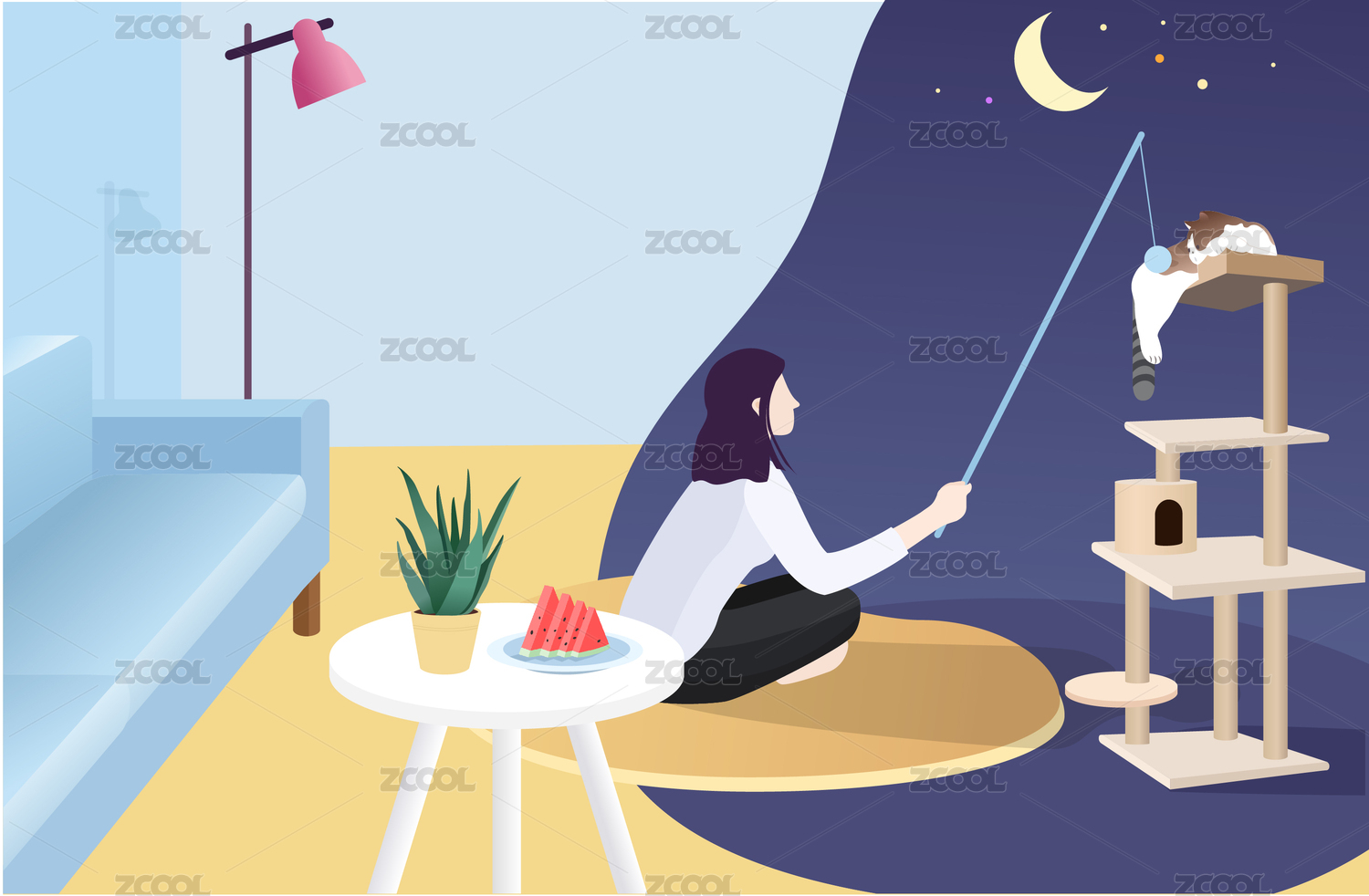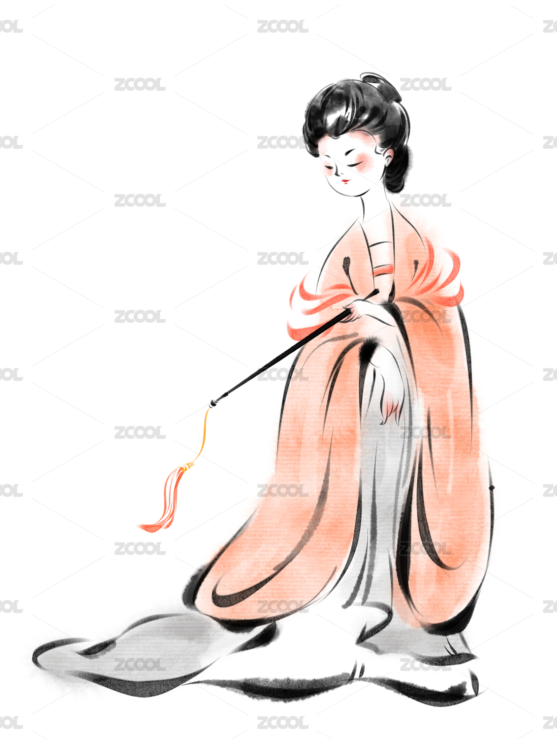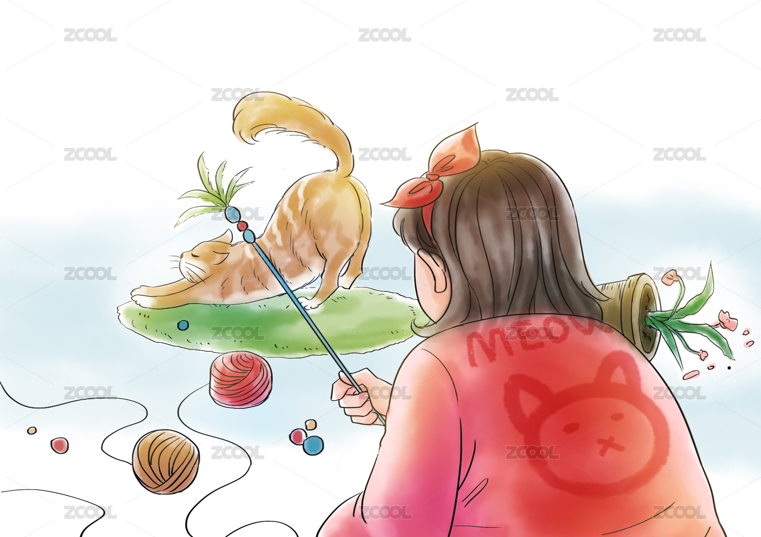 拿逗貓棒的水墨國(guó)風(fēng)仕女圖