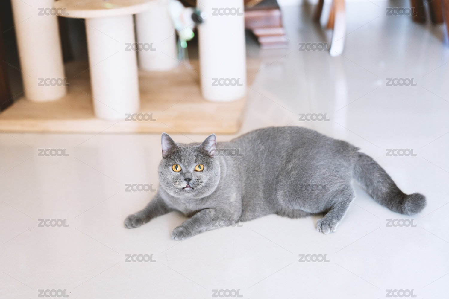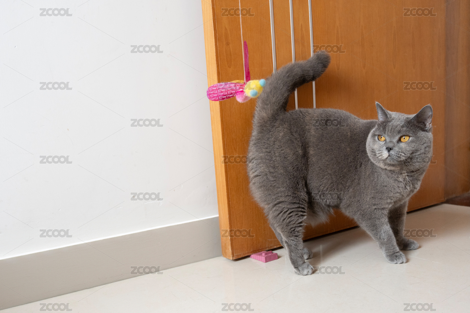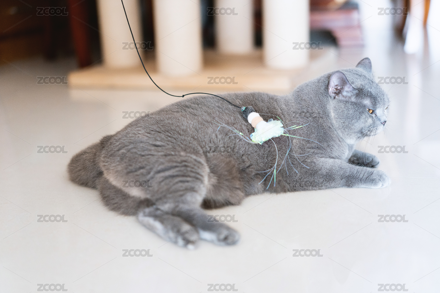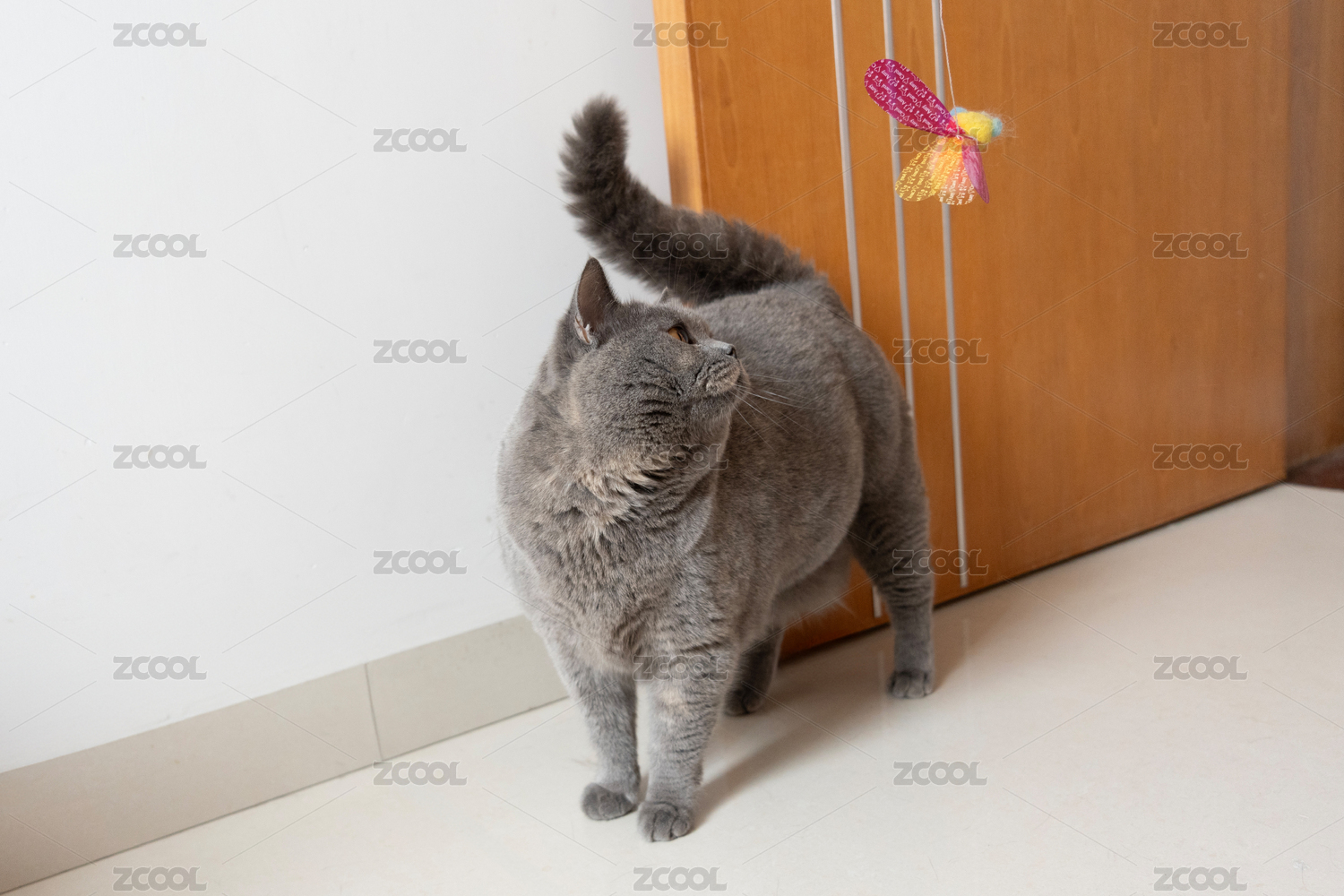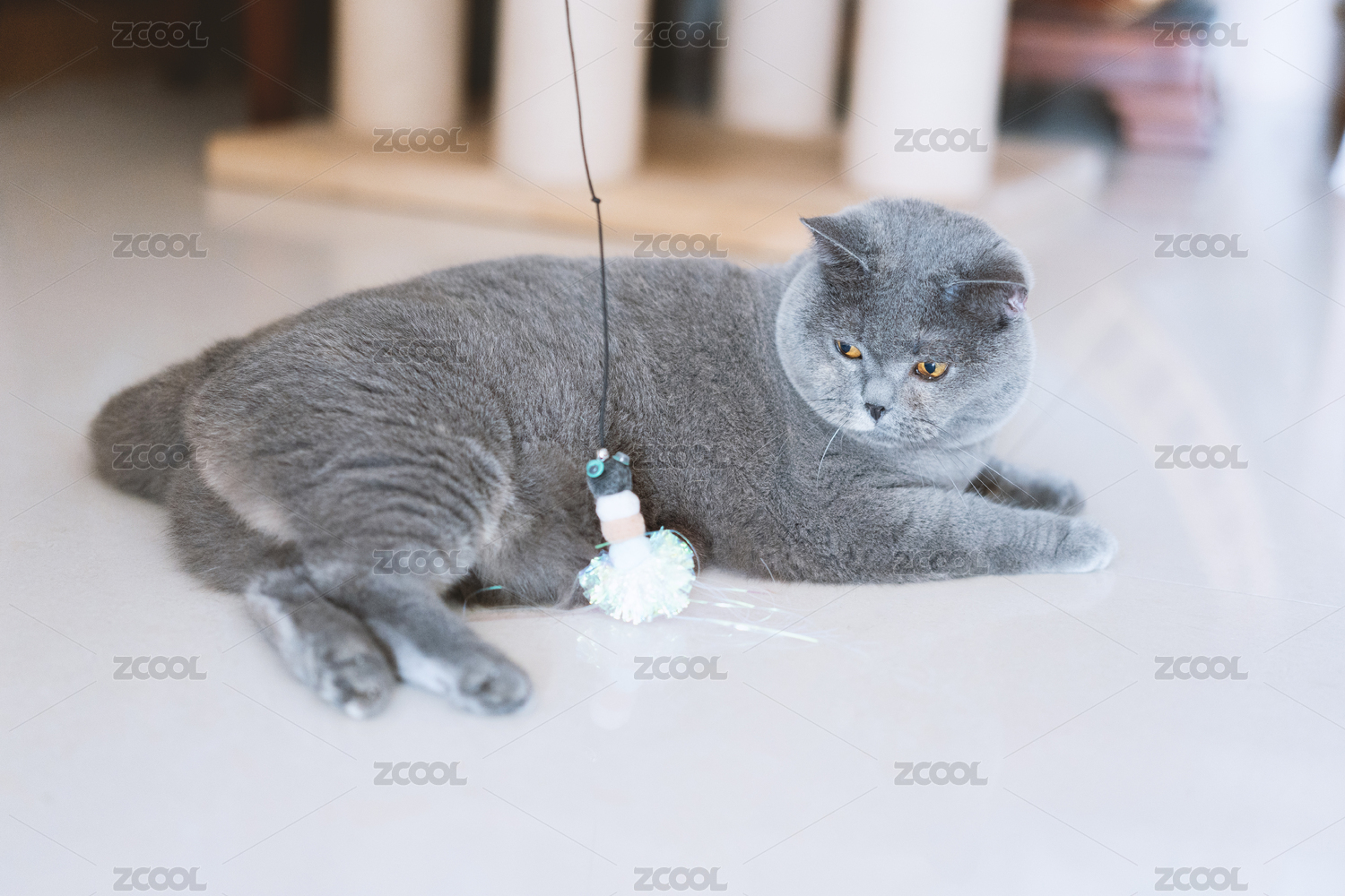 英國(guó)短毛貓好奇地盯著逗貓棒貓玩具,想玩耍