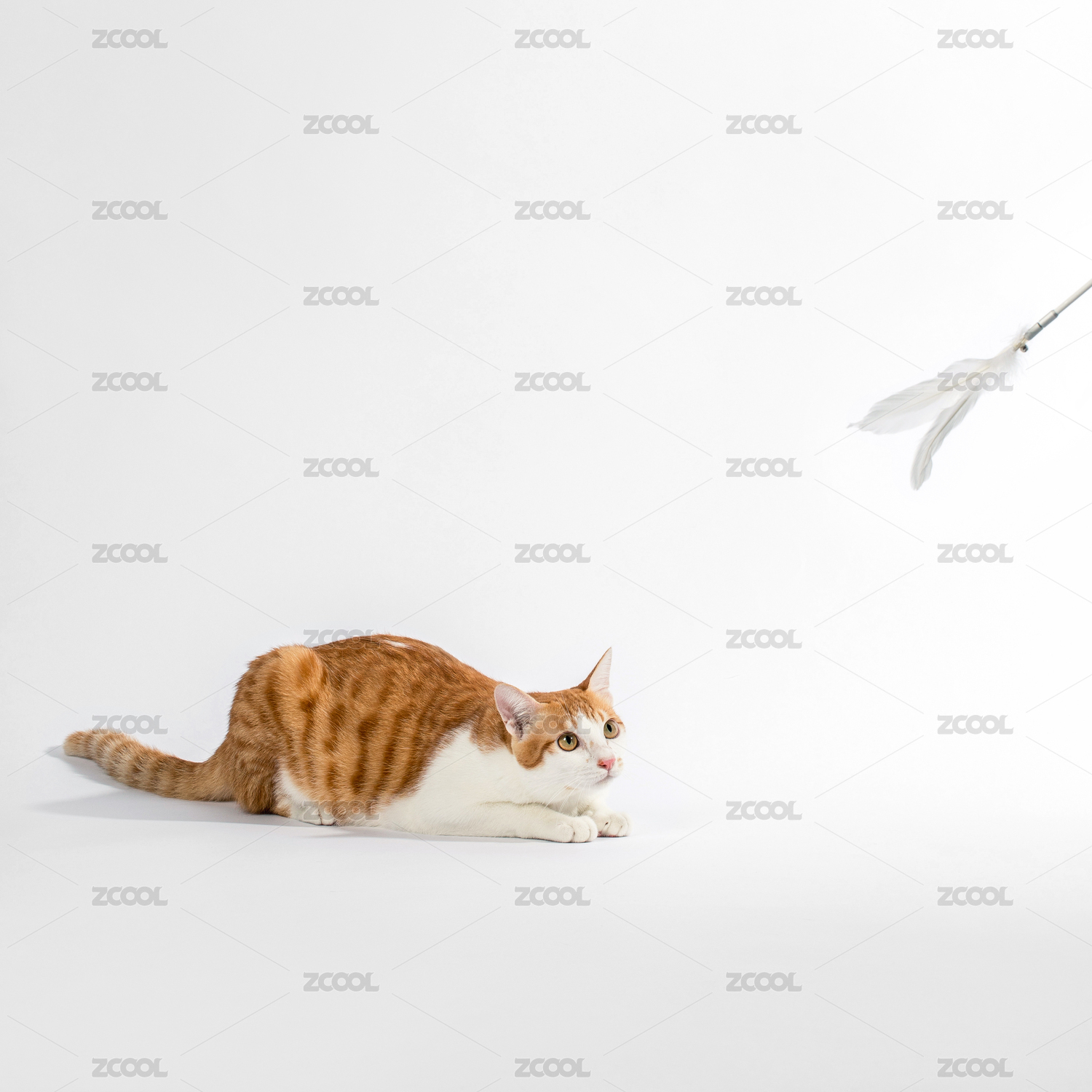 趴在地的橘貓,盯著上方的逗貓棒