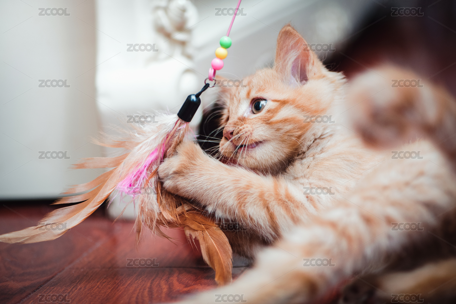 正在和逗貓棒玩耍的小橘貓