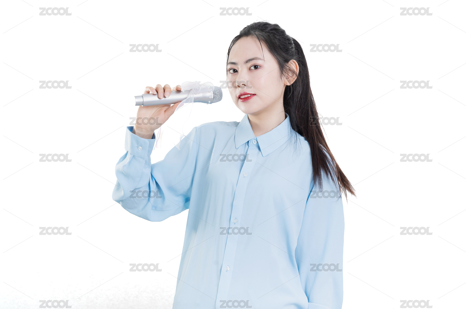 使用麥克風(fēng)快樂唱歌的藍色襯衣年輕女孩