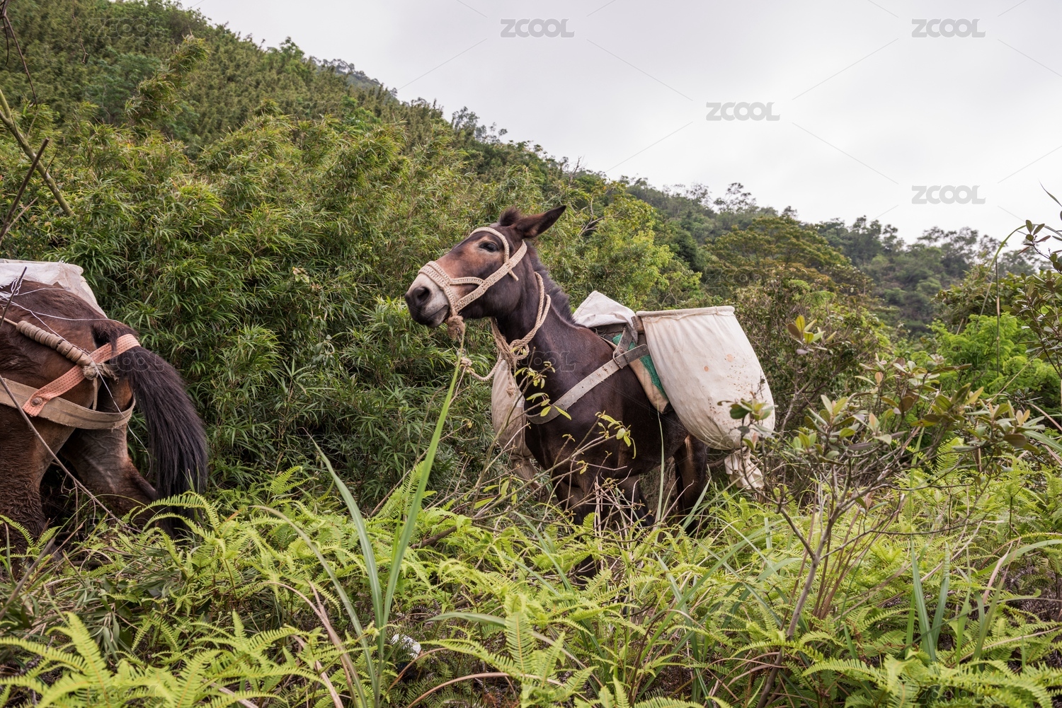 山頂上放牧吃草的騾子