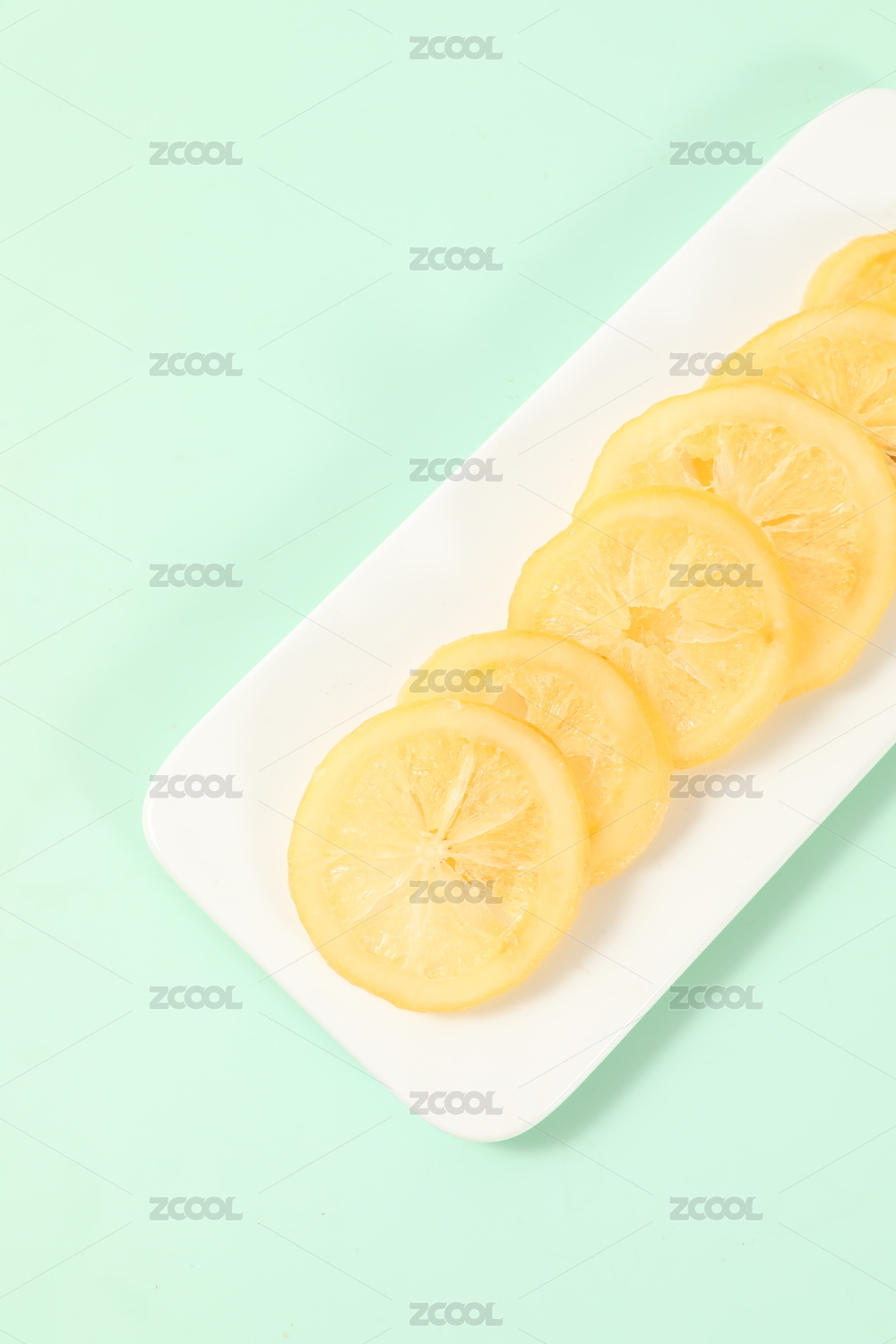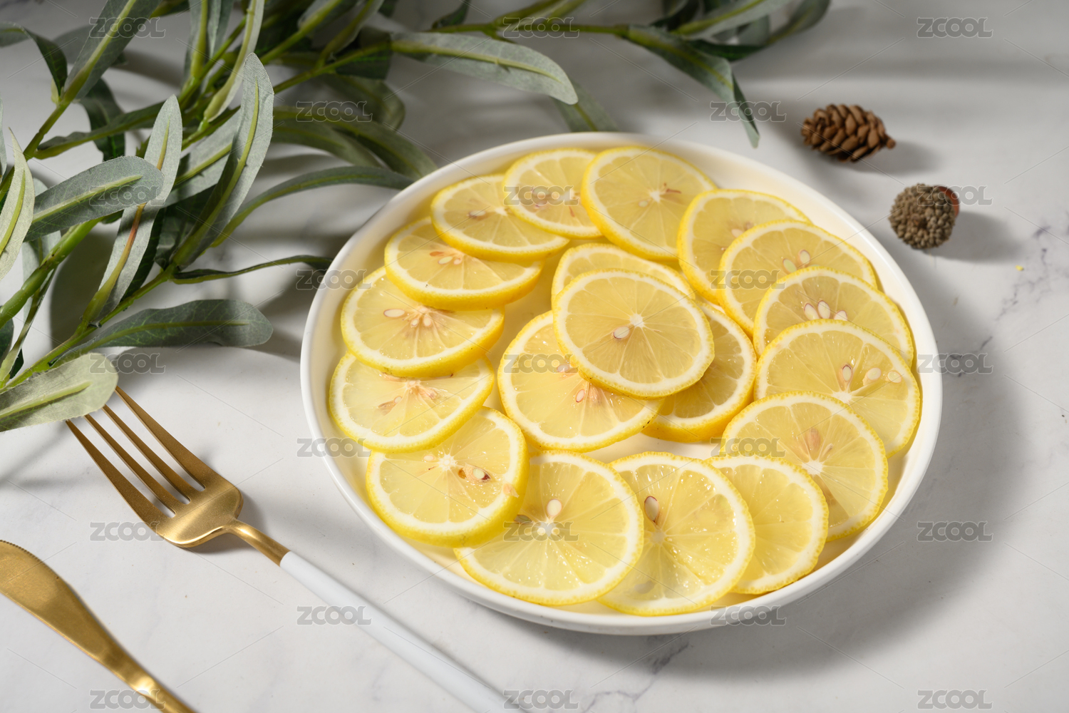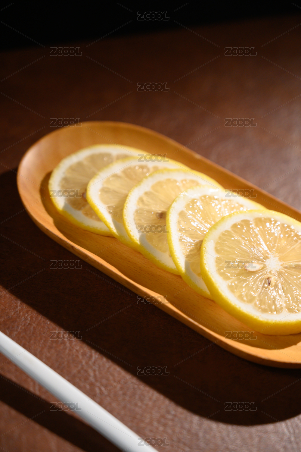 桌面上的白色陶瓷盤子里的新鮮檸檬片