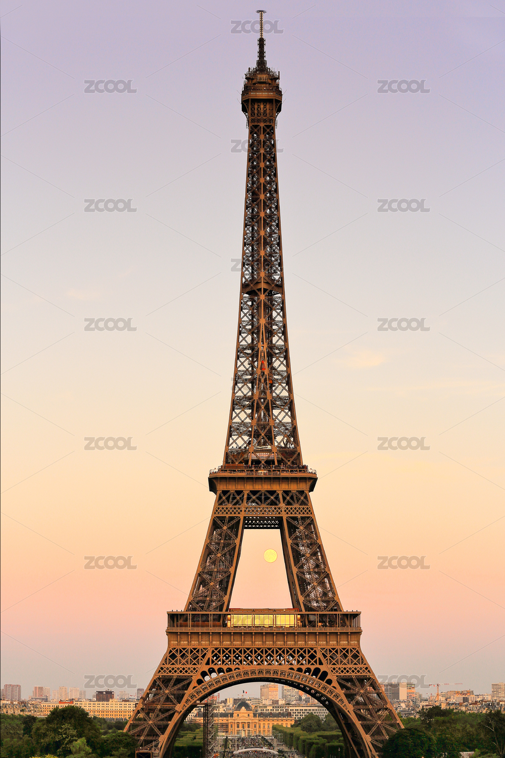 初升的圓月襯托著法國(guó)巴黎埃菲爾鐵塔高大的身姿